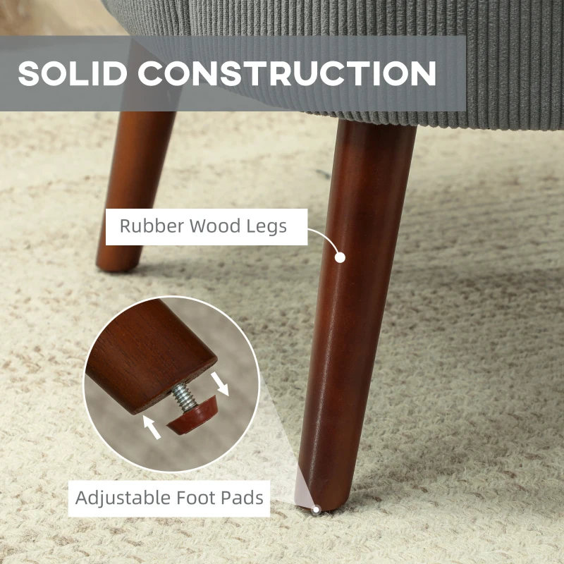 Relaxed retro armchair: Slightly curved shape, with rounded front and wing-shaped back – a bold and beautiful piece. This cosy chair looks great paired with a sofa, or standing alone by the fireside || Corduroy upholstery: Distinctive touch to this accent chair – a distinctive piece for the bedroom, living room, hallway and more || High-density foam padding: Also filled with ‘S’ springs and elastic bands, this is a firm and comfortable living room armchair. Small pillow included for extra support and comfort || Wood frame: A strong core for this bedroom chair, keeps you supportive as you sit and relax. Adjustable feet to keep it balanced || Dimensions: 78H x 69W x 69.5D cm. Maximum load 120 kg. Easy to assemble. Made from flame retardant materials