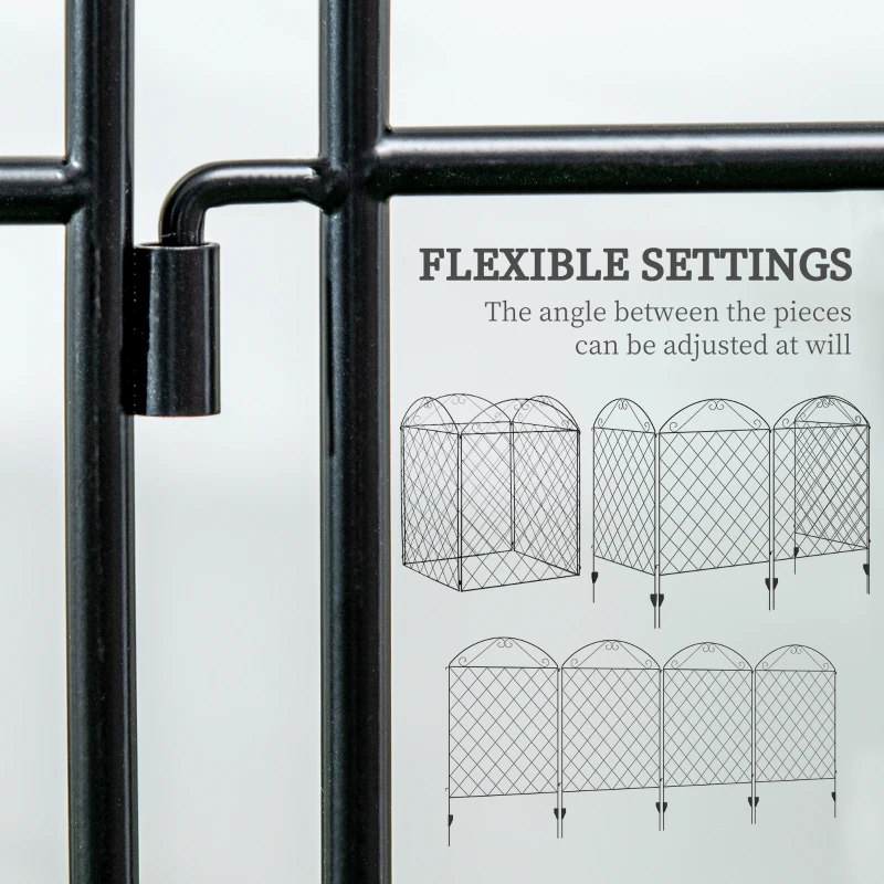3.5m long, flexible shape: Decorative garden fence can be set to a shape which you want. Great for plenty of different areas. Each piece measures 110H x 88Lcm. || Elegant design: Border fence features a gridded inner design, with gentle swirls on the top. A great home entrance piece. || Powder coated metal frame: Our metal fence panels feature a strong structure, suitable for outdoor use. || Easy to set up: Simply hook pieces together and push fence into ground with the anchor stakes. || Dimensions: 110H x 348Lcm. Single panel: 110H x 88Lcm.