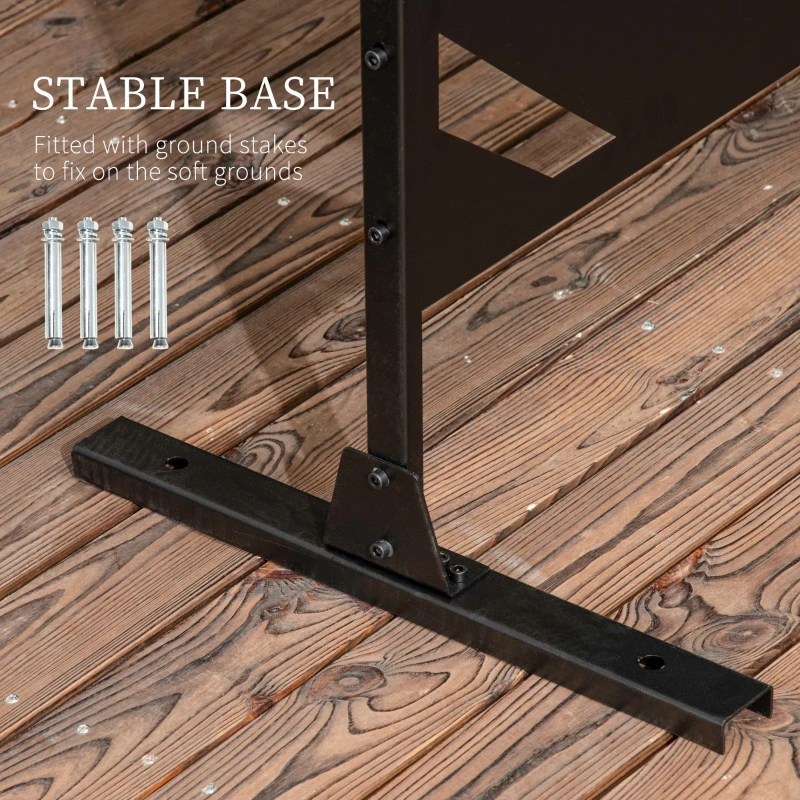 198 x 122cm freestanding garden screen: Use this divider in your outdoor spaces to create privacy – whenever and wherever you want. Your own personal paradise instantly. || Cut-out banana leaf motif: Pretty look for this metal garden screen – perfectly apt for garden surroundings. Cut-out parts allow light to gently seep through. || Two wide feet: This garden divider screen stands balanced and steady. Recommended to add weights too for safety. Four expansion screws included. || Steel structure: This garden partition screen is tough, with a painted coating for extra protection. || Dimensions: 198H x 122L x 45Wcm. Single panel: 60 x 120cm. Assembly required.