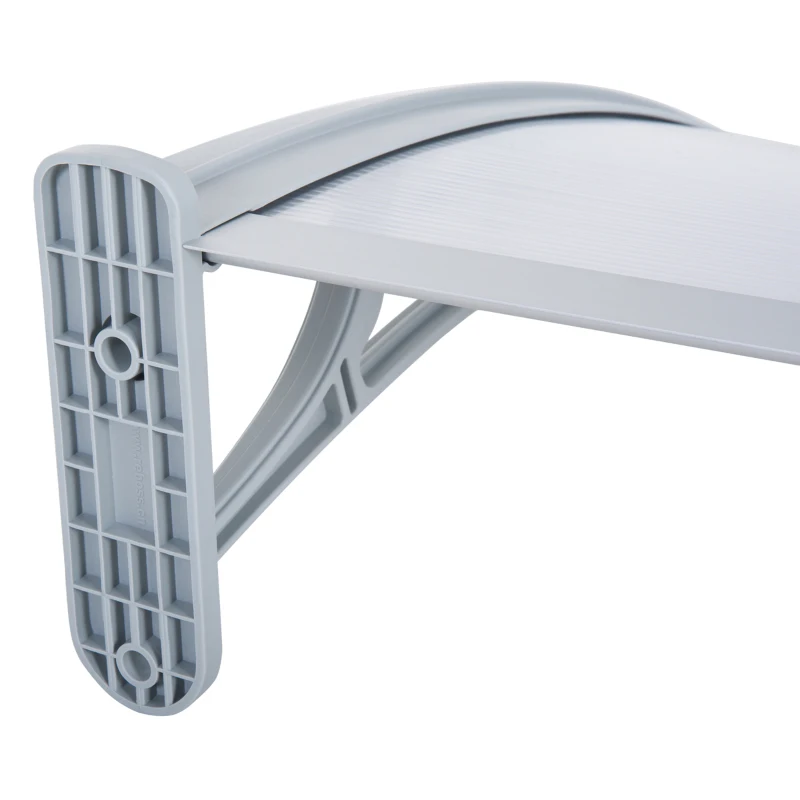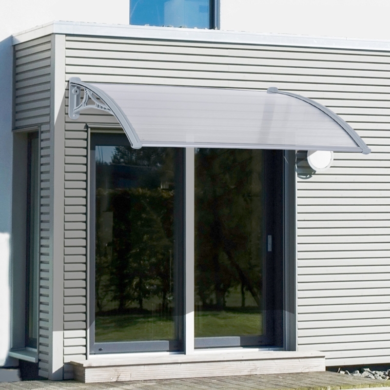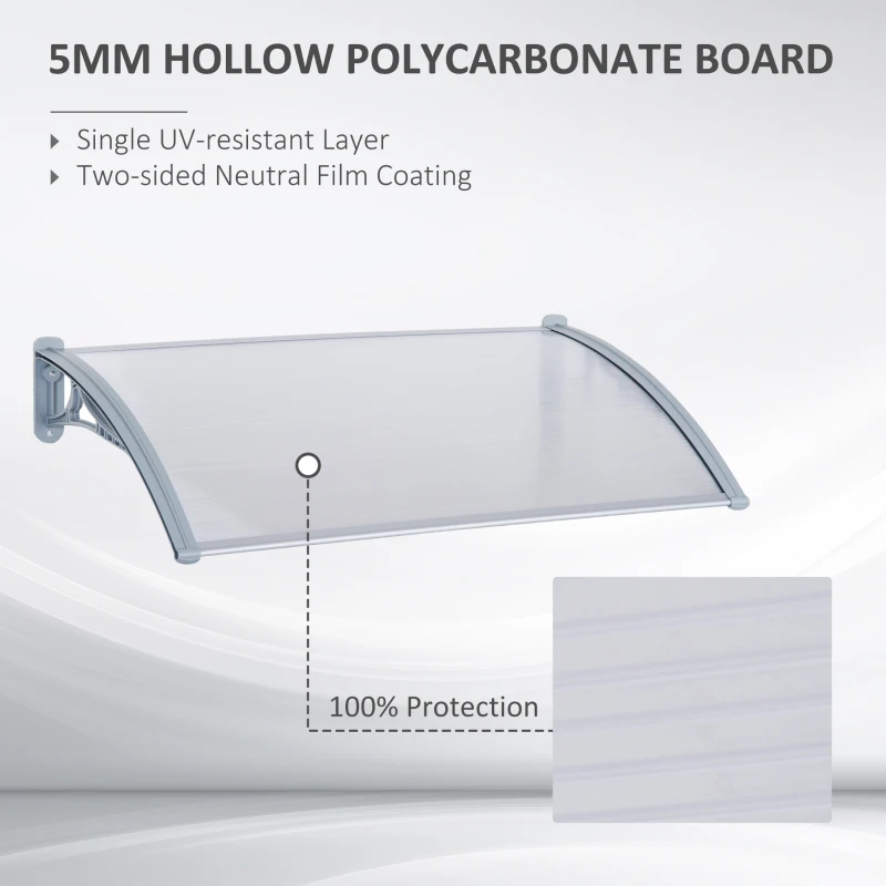 MODERN DESIGN: The sleek and modern canopy outdoor suitable for doors, windows, storefronts, and more. || STURDY STRUCTURE: Made from 5 mm clear hollow polycarbonate sheet, this outdoor canopy is sturdy for daily use. || UV PROTECTION: Anti-UV material makes this porch awning offers protection from harmful rays. || ACCESSORIES INCLUDED: Comes with all hardware and the porch canopy is ready to install || CANOPY DIMENSION: Overall Size: 140W x 70L x 21H cm. Assembly is required.