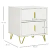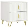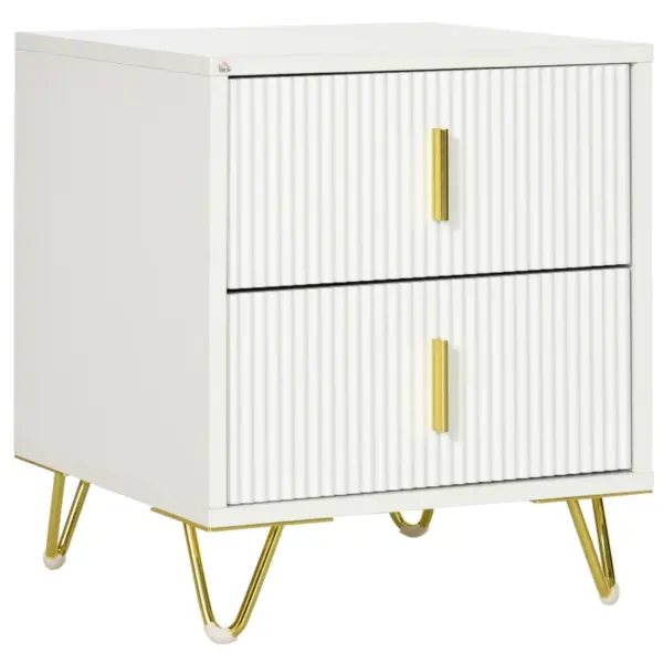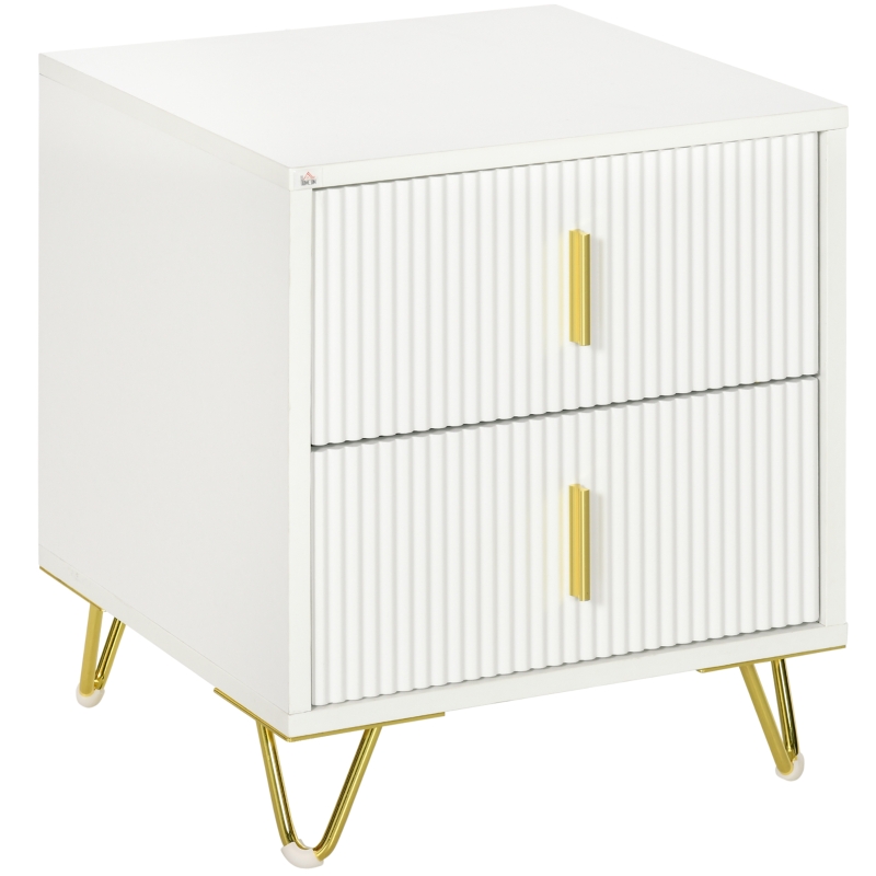Two drawers: Bedroom dresser offers lots of room for clothing – think tops, bottoms and accessories. Flat top offers display room for those items you want to show off. || Elegant design: Soft white colour, with ridged drawer fronts for a textural touch. Gold coloured handles and hairpin legs on bedroom drawers add an elegant touch. || Sturdy: Made from particle board and MDF blend, drawer chest is suitable for everyday use. A safe, supportive place for inner contents. || Versatile: Not just a chest of drawers, also use as a hallway unit for essentials. || Dimensions: 47H x 40W x 40Dcm. Maximum load 40kg. Assembly required.