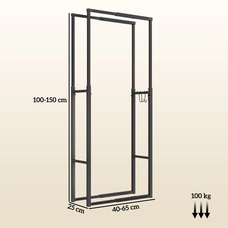 Two extending racks: Outdoor log store rack can be adjusted in width from 40-65cm and height between 100-150cm. Caters for when you have smaller and larger pieces of wood. || Metal frame: A strong fireplace log rack, for extended use. Resistant to light rusting and chipping. || ‘S’ hooks included: Hang tools and accessories on the side of this wood storage rack. Keep everything within close reach. || Sideless design: Air flows freely from all sides of this firewood storage log holder, keeping all pieces dry. || Dimensions: 100-150H x 40-65W x 25Dcm. Maximum load 100kg. Easy to assemble.