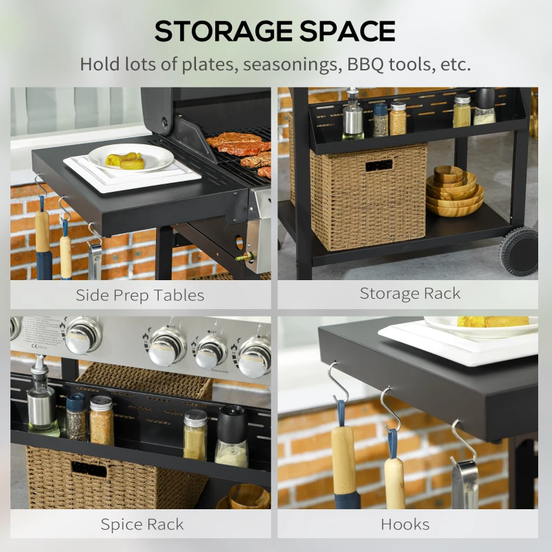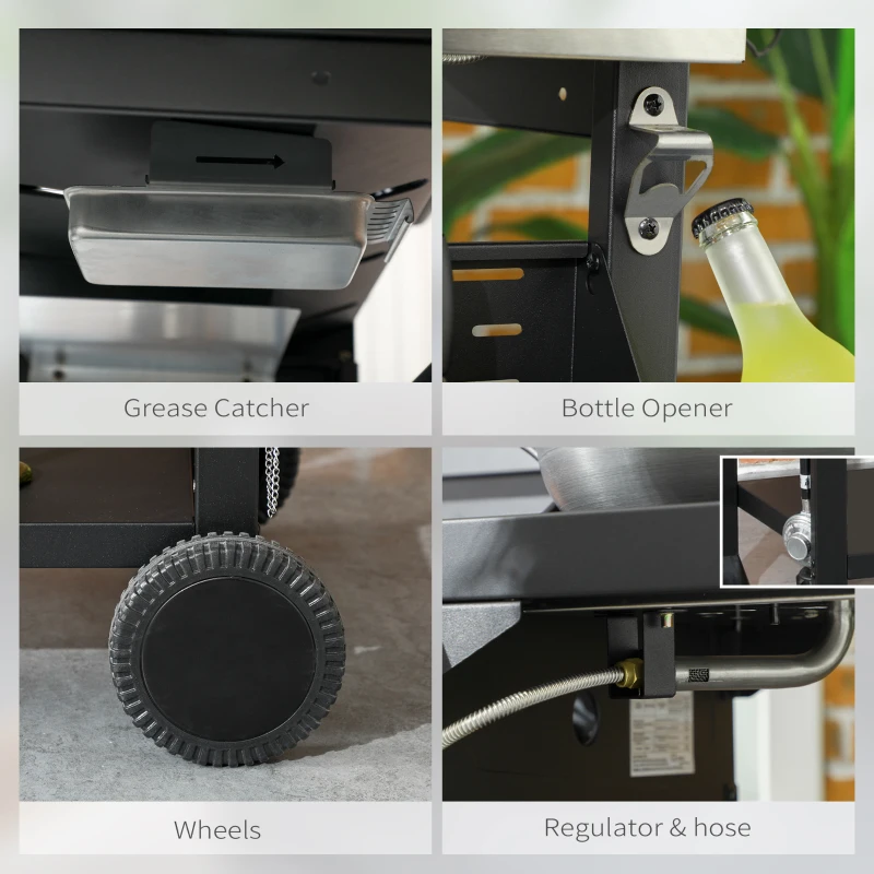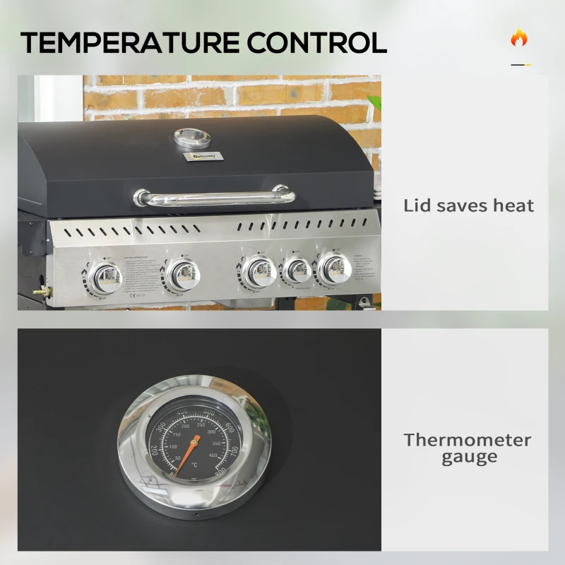 Five-burner gas grill: Our gas bbq grill is propane powered with five independent burners. Each burner controlled by the piezo ignition. || 2772cm² grill area: Gas grill cooks roughly 6-12 servings. Warming rack to keep just-cooked food warm, whilst maintaining flavour. || Lid with built-in thermometer: Lid to save heat and control smokiness. Thermometer to see temperature with lid down. || Multiple storage: Storage rack beside and underneath the bbq trolley, with front spice rack and side hooks. || Dimensions: 101H x 135L x 53Wcm. Grill grate: 42L x 33Wcm. Warming rack: 68L x 12Wcm. Side table: 43L x 32Wcm. Assembly required. Regulator and hose are included, and pre-installed;
