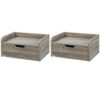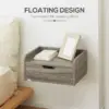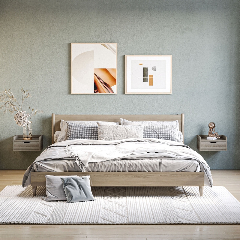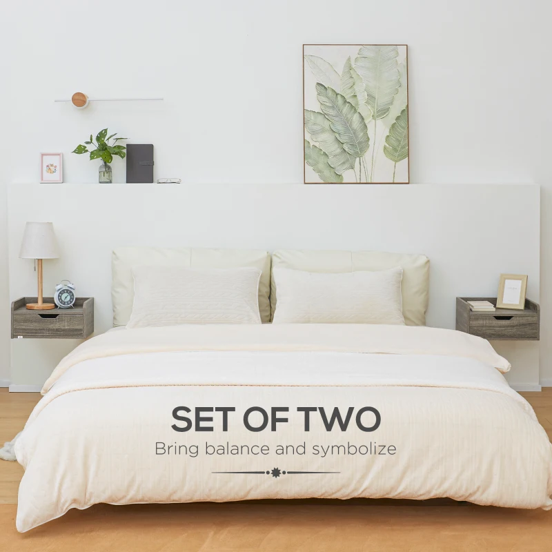 Wood-effect structure: Made from particle board for durability, these bedside tables adopt a beautiful natural look. Leave how it looks or design to your own style. || On-wall design: Cool and modern, attach these floating bedside tables to a place you want. Saves floor space too. || Sliding drawer and top shelf: Plenty of room for keeping bedtime essentials close to you. Flat top suitable for your alarm clock or light. || Set of two: Use on each side of the bed, or in separate rooms. || Dimensions: 19.5H x 40W x 30Dcm. Drawer inner: 6.2H x 32W x 23.5Dcm. Maximum load 10kg per table. Assembly required.