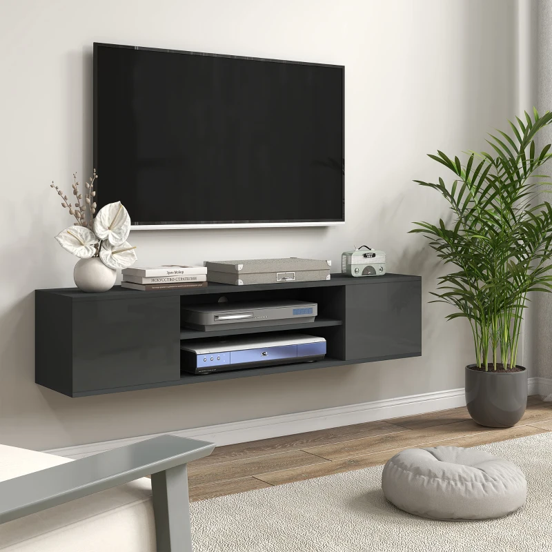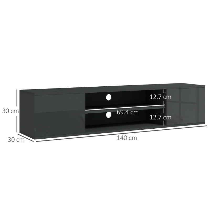 Floating design: A cool and modern tv table – attaches to your wall. Floating tv unit acts as a solid and minimal foundation to your screens and more. || Integrated storage: TV stand cabinet comes with two end cabinets and two middle shelves. Room for holding media devices and accessories. || Particle board body, high gloss finish: A sturdy media unit suitable for everyday use. Smooth, slightly reflective finish looks great. || Cable holes: Thread wires through the back of this high gloss tv unit – keeping them altogether and helping to prevent tangling. || Dimensions: 30H x 140W x 30Dcm. Cabinet inner: 27H x 32W x 26.8Dcm. Shelf: 12.7H x 69.4W x 26.8Dcm. Maximum load 30kg. Maximum screen size: 60″. Assembly required.