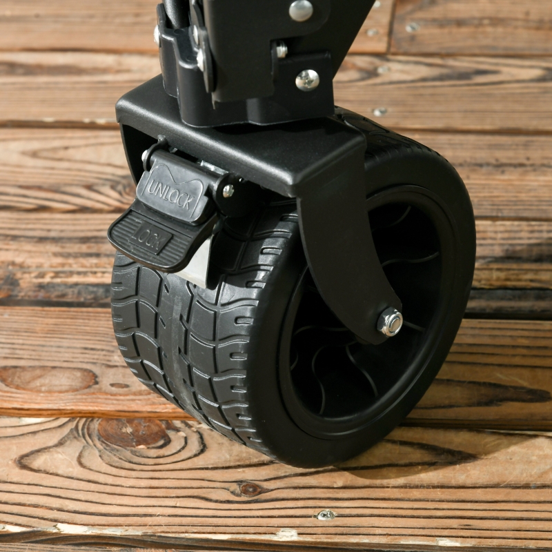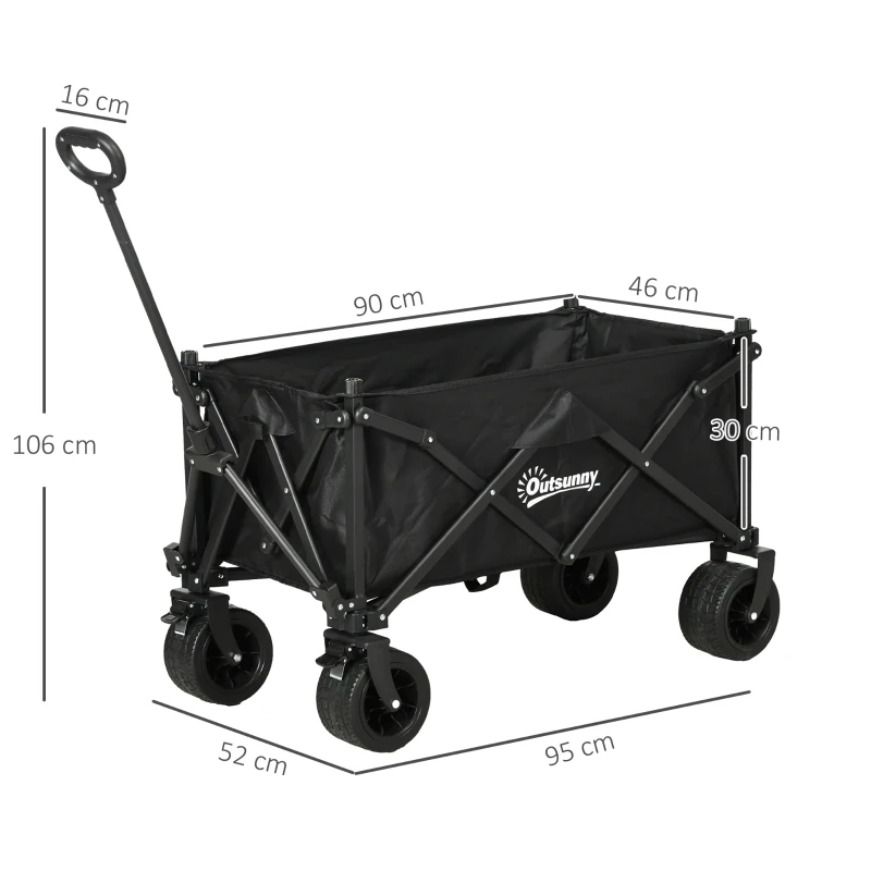 110L spacious trolley on wheels: A must for outdoor trips, take plenty in this grocery cart – saving time, effort and energy. || Folding steel frame: A strong and reliable structure which keeps in shape for peace of mind whilst on-the-go. Folding beach trolley is easy to store and fits into the boot of your car. || Four multi-ground wheels: Two rotate 360° to help prevent collapsible camping trolley getting stuck. Two wheels have brakes to keep folding trolley cart stable. || Telescopic handle: Extends out to pull folding trolley along without having to bend down €“ preventing you from straining your body. || Dimensions: 106H x 95L x 52Wcm. Folded: 26H x 70L x 38Wcm. Maximum load 120kg. Easy to assemble.