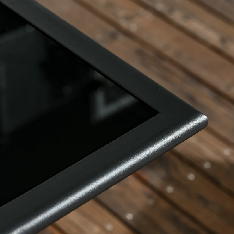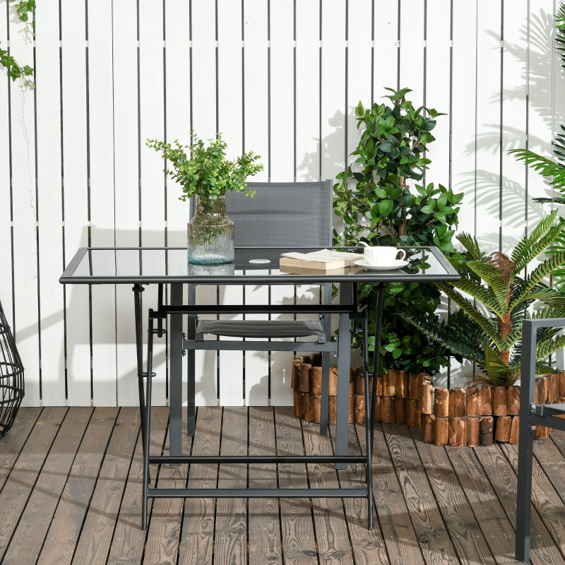 COMPACT DESIGN: This glass garden table can be folded down for convenient storage in a corner area when not in use. No assembly is required, just unfold and the table is ready to use. || UMBRELLA READY: A center hole in the middle of the folding garden furniture for you to insert an umbrella into for shade on sunny days. Hole size: Φ42mm / Φ50mm, fits Φ38mm / Φ48mm umbrella pole. || TEMPERED GLASS TABLETOP: Adds a sleek look to the garden table, with a smooth surface which can be cleaned easily with a wet cloth. || STURDY STRUCTURE: Durable and tough metal frame with a powder coating for extra strength, making this outdoor dining table a mainstay in your home. The protective foot pads is non-slip and prevent scratch on the tubing and the floor. || OUTDOOR TABLE INFORMATION: Overall Dimension: 110L x 70W x 70Hcm. Folded Dimension: 110L x 97W x 7Hcm. Weight Capacity: 30kg.