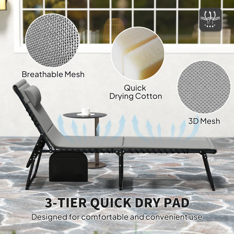 5-level reclining set: Enjoy personalized relaxation with this padded folding chaise lounge set, easily adjustable to a maximum reclining angle of 180 degrees. With double elastic straps for pressure-relieving comfort under the sun || Folding outdoor chaise with pocket: Fold the outside lounge chairs for space-saving storage and easy transport with a carrying handle. The convenient side storage pocket keeps your magazines within quick and easy reach, great for relaxation || Quick-drying pad: Each outdoor lounge chair features a pad made from 3D mesh and breathable mesh, with quick-drying cotton in between for convenient use after getting wet. The pad and head pillow provide luxurious comfort for napping and sunbathing || Robust construction: Built with powder-coated steel tubes, our sun tanning chair set provides reliable safety and stability for you whether sitting or reclining, within 264 lbs. (120 kg) load capacity || Dimension: 68W x 189D x 36H cm; Folding size: 76L x 68W x 15H cm; Weight capacity: 120 kg; No assembly required