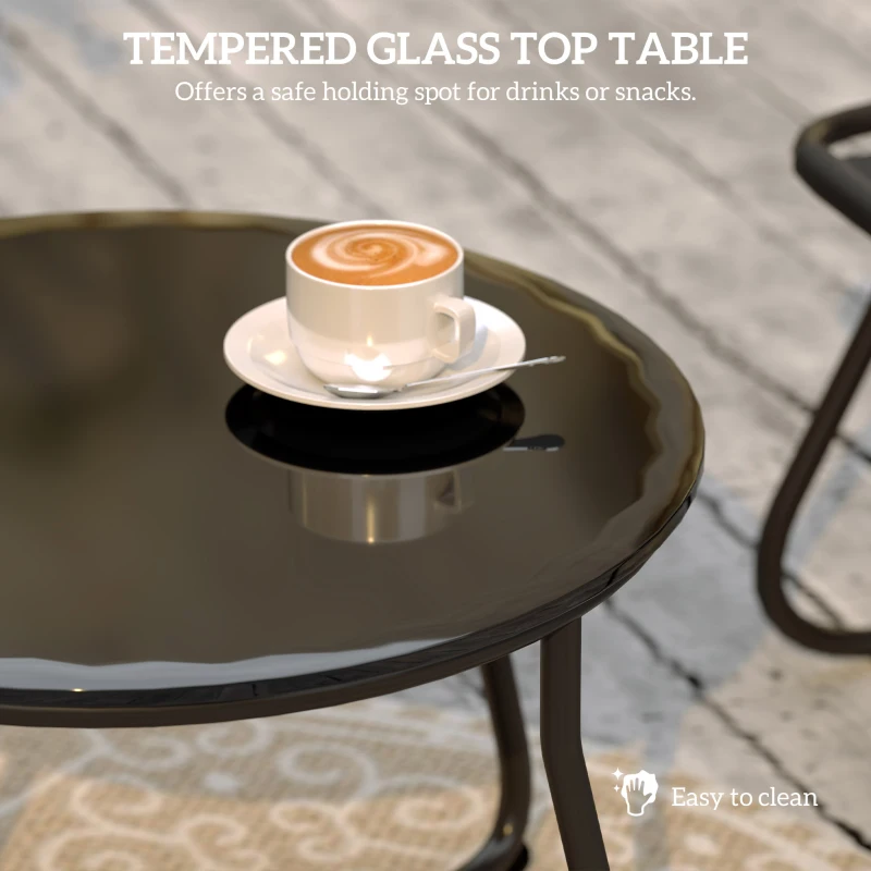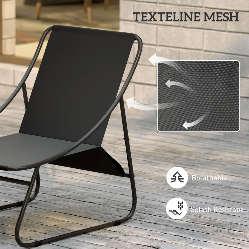 Four-piece set: Comes with a two-seater sofa, two chairs and a round coffee table. The garden sofa set offers room for up to four people – room for you to relax with company. || Smooth curved seats: Keep comfortable as you lie back and relax on the chairs and sofa in this outdoor furniture set. Padded cushions are soft, covered in breathable texteline mesh, to sink in gently all afternoon long. || Steel frames: Powder coated for extra strength, splash-resistant fabric for easy clean-up, all pieces in this outdoor table and chairs set are tough – for prolonged use outdoors. || Glass-top round coffee table: A sleek and modern touch to this garden sofa set. A place for holding drinks, snacks and more right next to you. || Dimensions: Loveseat: 85H x 122W x 87D cm. Chair: 85H x 62W x 87D cm. Table: 39H x Φ60 cm. Maximum load: Loveseat: 240kg. Chair: 120kg. Table: 50kg. Easy to assemble.