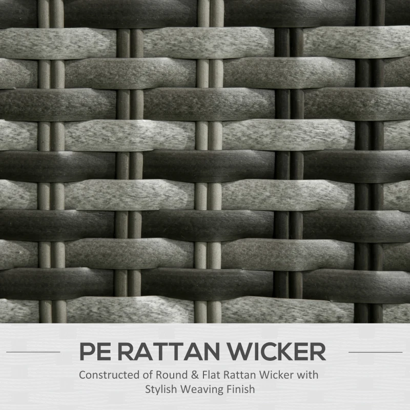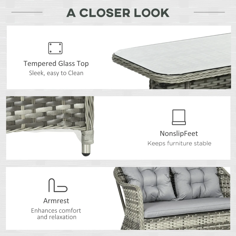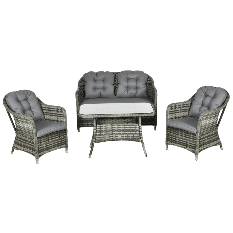 Four-piece set: Comes with two chairs, loveseat and matching table. Small garden furniture seats up to four people – great for relaxing in your garden and outdoor spaces. || Tempered glass top table: A stylish touch, which also acts as a safe and solid centrepiece. Easy to wipe clean. || Comfortable: Soft padded cushions on the seats and backs of each chair. || Aluminium wrapped in rattan: Core metal frame for strong support, with plastic wicker for a durable and stylish garden look. || Dimensions: Loveseat: 84H x 129W x 79Dcm. Chair: 84H x 64W x 79Dcm. Table: 62H x 100L x 60Wcm. Maximum load: Loveseat: 240kg. Chair: 120kg. Table: 50kg. Assembly required.
