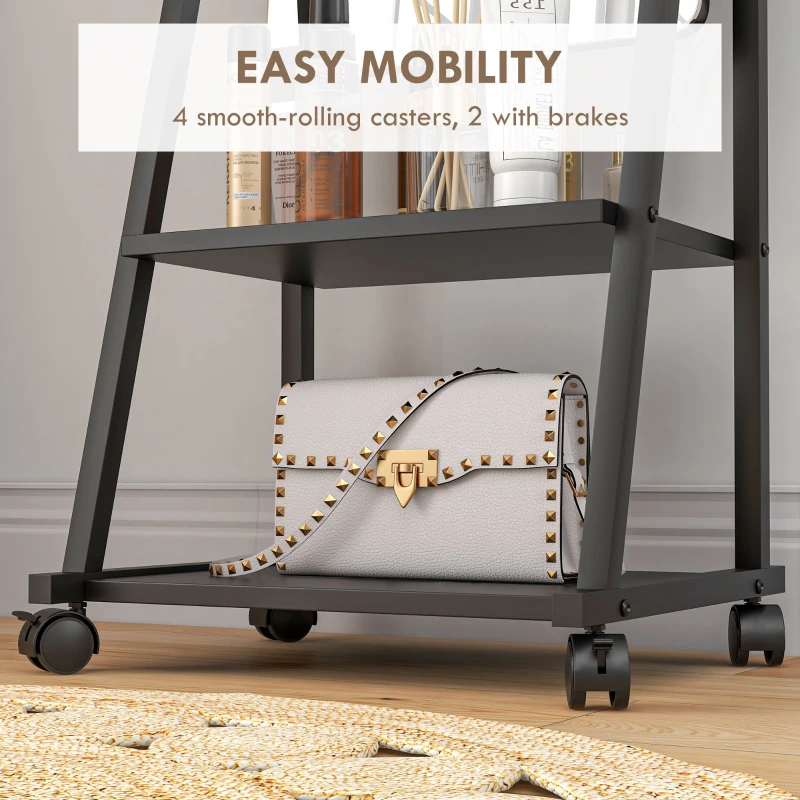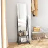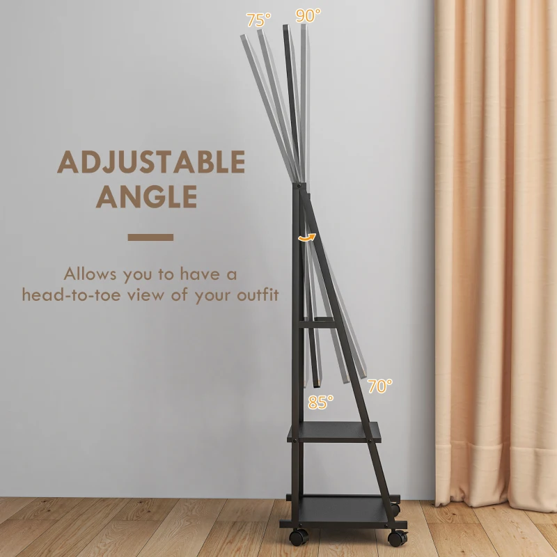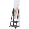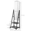 Four-position adjustable angle: Set this long mirror to 70°, 75°, 85° and 90°. Set and secure with the included bolts to lock into place. || Two shelves: Floor mirror has handy storage – great for keeping makeup, products and other accessories close. || Long length: A full body mirror which allows you to get ready and see your whole outfit. || Four wheels: It’s easy to move this bedroom mirror around. Two brakes to lock into place. || Dimensions: 155H x 42W x 37Dcm. Mirror: 108H x 37Wcm. Shelves: 14H x 7.5W x 27.5Dcm and 23H x 37.5W x 30Dcm. Assembly required.