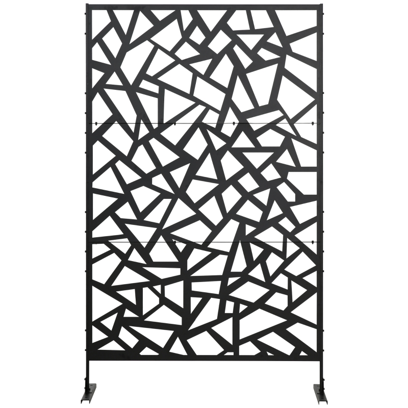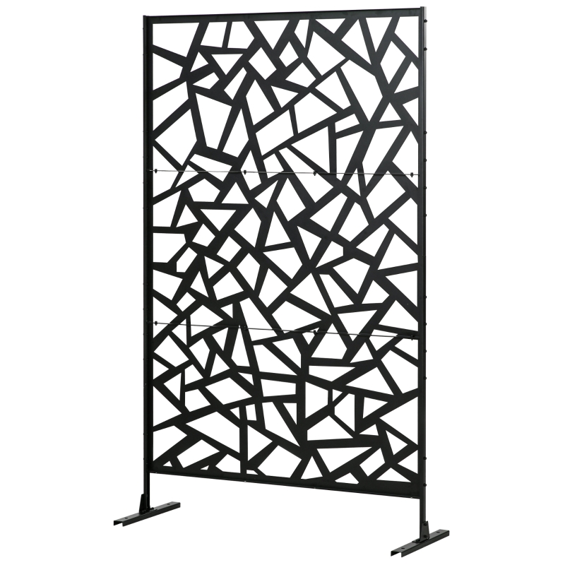 198 x 122cm freestanding garden screen: Use this divider in your outdoor spaces to create privacy – whenever and wherever you want. Your own personal paradise instantly. || Cut-out irregular figure motifs: Pretty look for this metal garden screen – perfectly apt for garden surroundings. Cut-out parts allow light to gently seep through. || Two wide feet: This garden divider screen stands balanced and steady. Recommended to add weights too for safety. Four expansion screws included. || Steel structure: This garden partition screen is tough, with a painted coating for extra protection. || Dimensions: 198H x 122L x 45Wcm. Single panel: 60 x 120cm. Assembly required.