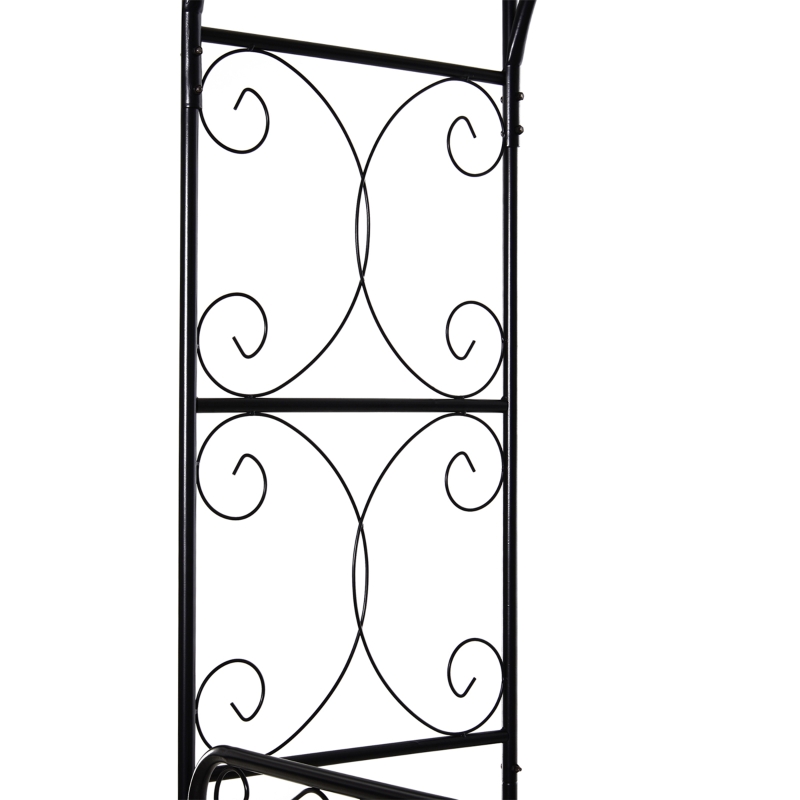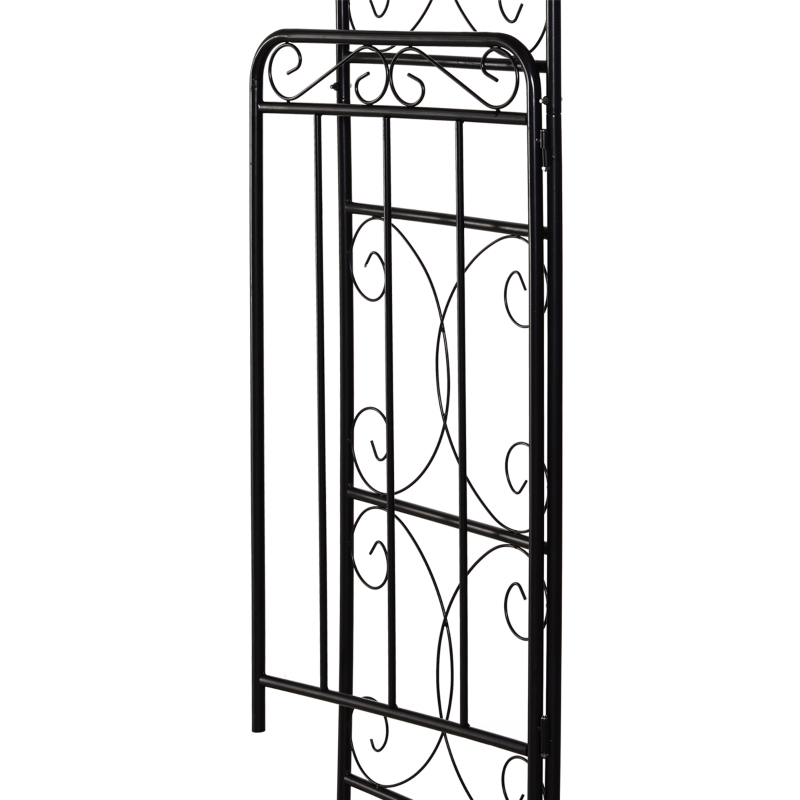 ELEGANT ENTRANCE: A beautiful way to make an impact in your outdoors, our garden archway is perfect for small and large gardens alike. Scrolling all over for a beautiful finish. || TWO GATES: Allows easy access through the metal trellis, whilst creating privacy when closed. Latches for extra security when you’re out. || SIDE TRELLIS’: The side trellis of the rose arch allow climbing plants and vines to grow up with support, with rails on the top to hang flowers and baskets from creating a look which is full of colour and greenery. || METAL FRAME: The garden arch with gate has a durable and tough structure, with a matte black powder coating for extra strength. SPIKED FEET: Sharp ends for you to spike frame in the ground, with horizontal bars to stop it sinking into the ground. || DIMENSIONS: 215H x 108L x 45Wcm. Single door: 95H x 50Wcm. EASY TO ASSEMBLE.