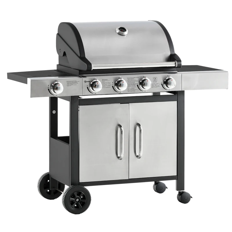 Five-burner design: Features a main gas BBQ with four separately-controlled sections. Side gas burner for extra cooking room – great for when there’s different food. || Storage and holding space: Shelf on each side of gas barbecue for convenient holding room, warming rack for just-cooked food and cupboard for closed storage. || Solid shell: A blend of metal and stainless steel, the gas grill is tough and durable. The food-grade enamel grill for extra strength and heat resistance. Handles keep cool for safety. || Four wheels: Two are universal wheels with brakes, easy to move around your garden and safe to stand in place. || Dimensions: 113H x 118L x 55Wcm. Storage cabinet: 52H x 64.5L x 34Wcm. REGULATOR AND HOSE INCLUDED.