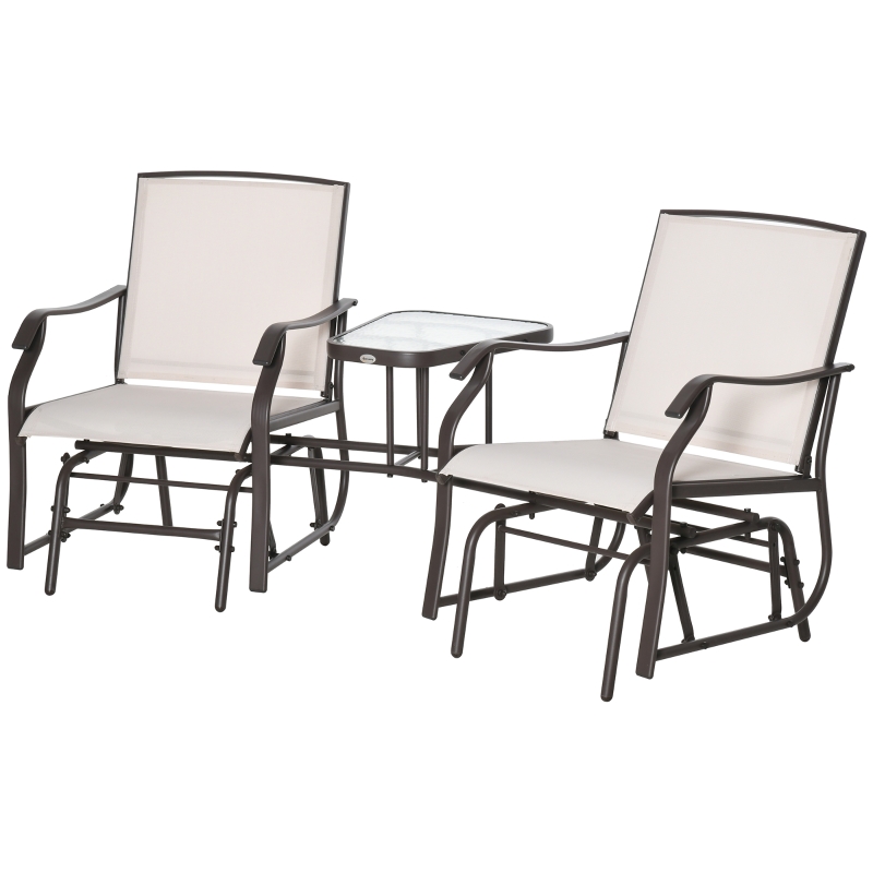 All-in-1 glide seat duo set: Tete a tete seat style – great for relaxing by yourself or with a friend. || Middle glass-top table: Made from glass for easy maintenance. Excellent place on garden rocker for keeping drinks, books and more close to hand. || Mesh fabric top: Breathable, so companion bench is suitable for hotter temperatures. || Steel frame: Powder coated for extra strength, glider bench supports you. || Dimensions: 89H x 195L x 81Wcm. Seat: 55W x 51Dcm. Table: 19.3L x 43.3Wcm. Seat to floor: 43cm. Maximum load: Chair: 160kg. Table: 15kg. Assembly required.