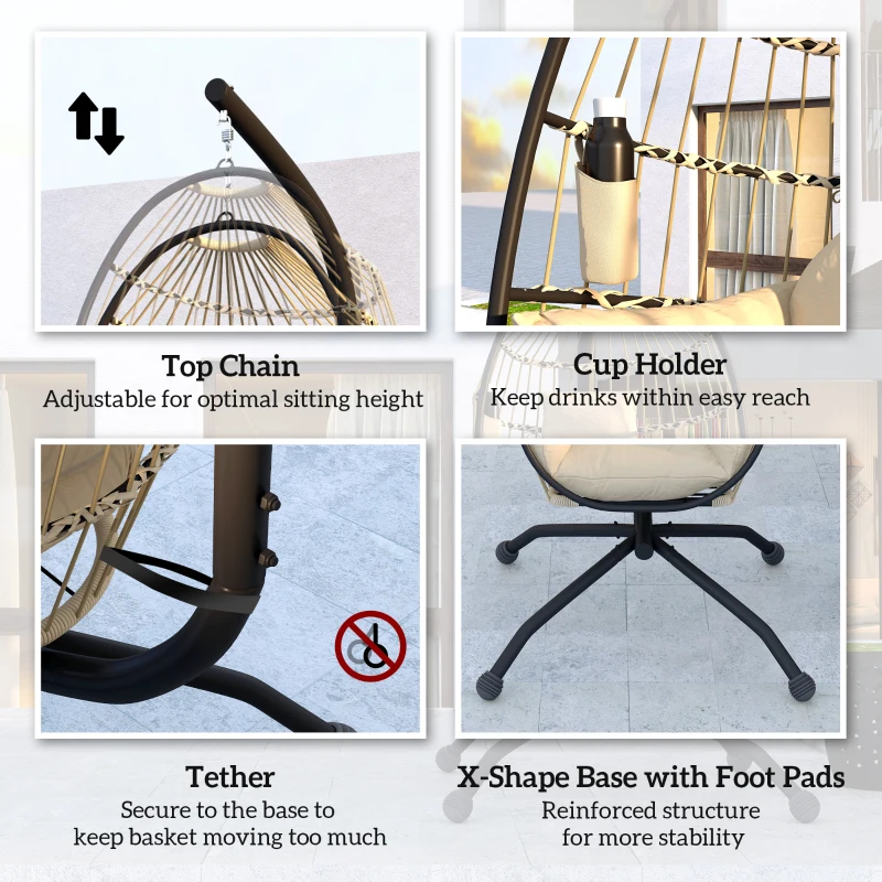 Spacious egg swing chair: Wide seat with a unique hollowed-out design like a breathable and cool bird nest to soothe your heart. Rope weaving makes it a relaxing place with beautiful visuals for indoor and outdoor. || Cloud-like comfort: Sink into the garden egg chair with a thickened 20cm large cushion and a 12cm thick head pillow, both with removable covers for easy cleaning. Grab a book and drink, unwind in peaceful solitude, or enjoy the sunset outdoors. || Folding basket: Take out when not being used – keep it protected. A tether secured to the base reduces movement for a smooth, relaxing swing. Keep a drink in place with a side cup holder. || Steel frames, adjustable height: Powder-coated steel frame and X-shaped base with foot pads support up to 120kg. Adjustable chain lets you personalize this outdoor swing chair’s height for optimal swinging. || Dimensions: 192H x 120L x 88Wcm. Seat size: 53H x 72W x 56Dcm. Basket folding size: 19H x 130L x 78Wcm. Maximum load 120kg, easy assembly required. Note: Please use a protective cover when not in use to shield your chair from rain, wind or dirt.