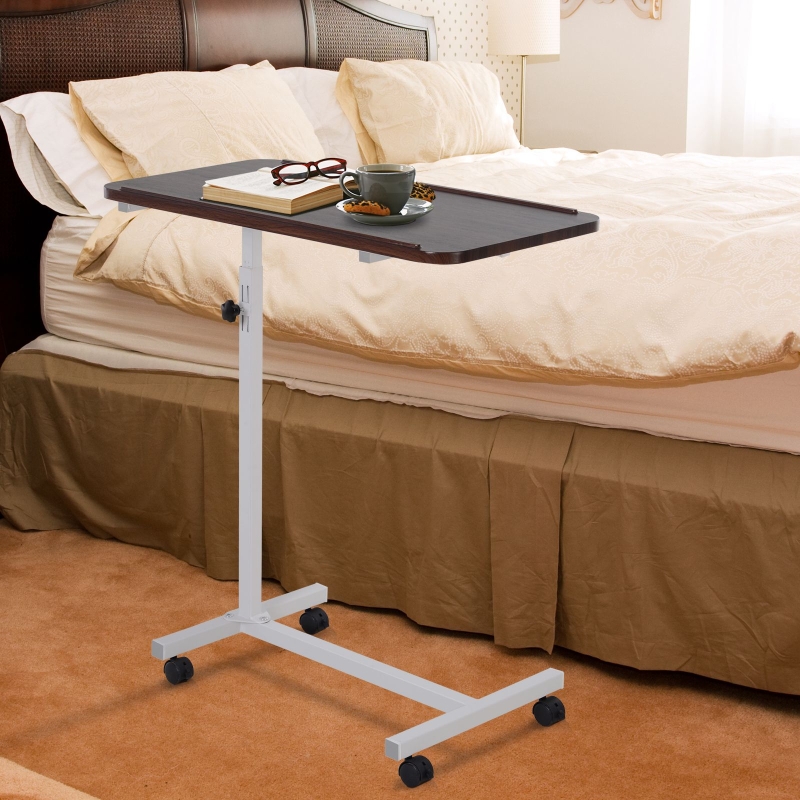 DURABLE: This bed tray for eating elderly features a robust steel frame and an MDF tabletop with PVC edge banding for long-lasting use. || UNIQUE C-SHAPE DESIGN: Unique C-shape design make it ideal for various occasion. It can be bed side table, sofa side table, laptop tray for bed, bed tray for eating elderly etc. EDGE DESIGN: Ridge around the edge design, avoid items from slipping off. || EASY MOBILITY: 4 smooth rolling casters with 4 locking brakes make this over bed table organiser super simple to move and relocate throughout the house. || CUSTOMISABLE COMFORT: This over bed table with adjustable height can suit your sofa or personal needs. || DIMENSION: Overall Dimension: 77L x 40W x 76-100H cm; Weight Capacity: 20kg.
