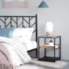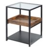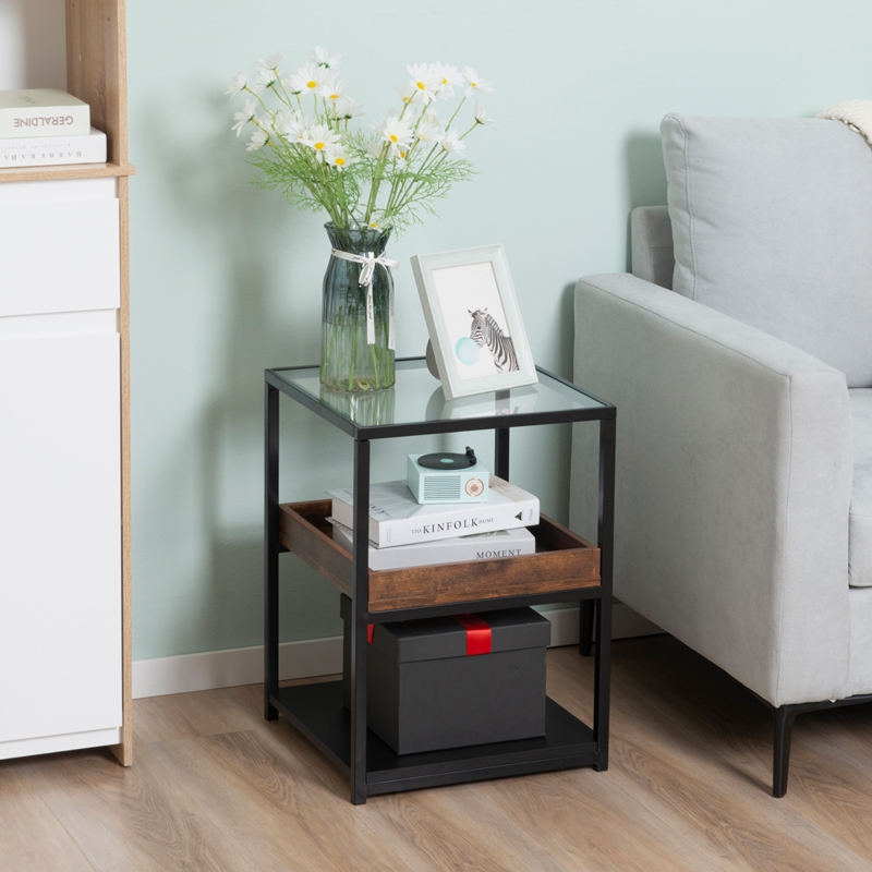 Unique three-tier design: Formed of a bottom metal shelf, middle wood-effect tray and top glass – striking and beautiful. Best as a side/coffee table – how about as a nightstand too? || Middle tray with low sides: Safely keeps stored items inside – lower chance of them falling off and becoming damaged. || Steel frame: A solid core structure, supporting the table and its contents whilst in use. Glass and particle board parts are also tough. Anti-slip foot pads to protect floor. || Dimensions: 55H x 40L x 40Wcm. Glass top: 38W x 38Dcm. Middle tray: 4H x 37W x 34Dcm. Bottom: 24H x 39.9W x 39.9Dcm. || Maximum Load 15KG. Assembly Required.