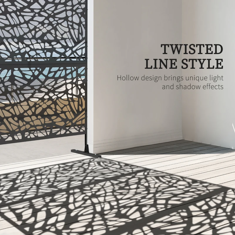 198 x 122cm freestanding garden screen: Use this divider in your outdoor spaces to create privacy – whenever and wherever you want. Your own personal paradise instantly. || Cut-out line motifs: Pretty look for this metal garden screen – perfectly apt for garden surroundings. Cut-out parts allow light to gently seep through. || Two wide feet: This garden divider screen stands balanced and steady. Recommended to add weights too for safety. Four expansion screws included. || Steel structure: This garden partition screen is tough, with a painted coating for extra protection. || Dimensions: 198H x 122L x 45Wcm. Single panel: 60 x 120cm. Assembly required.