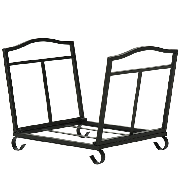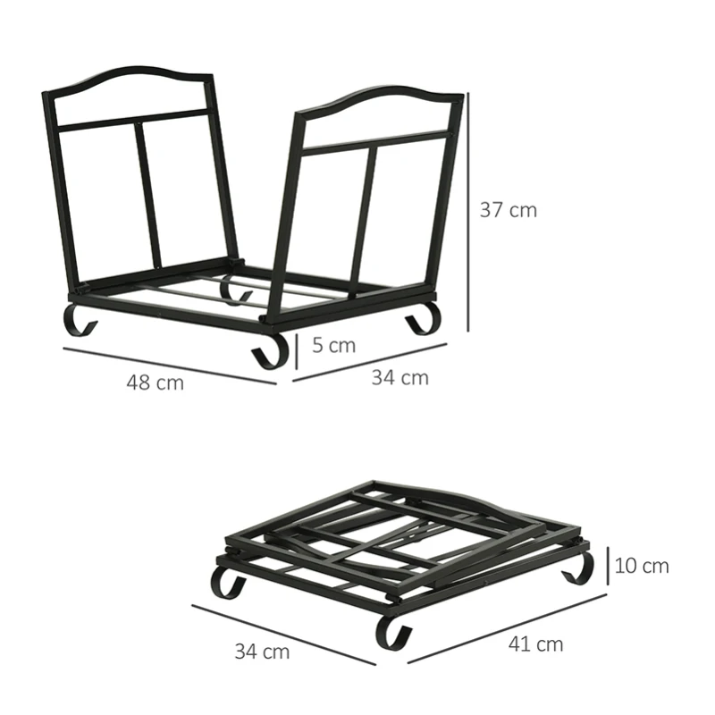 METAL FRAME: Powder coated for extra strength, it’s a tough and sturdy structure, holding fire wood logs safely together. This firewood holder Can be folded. || SLATTED BOTTOM: No water/liquid build up – paired with the four legs to elevate and aerate. A practical log holder for fireplace keeps logs dry and fresh as possible. || SCROLLED FEET: A decorative touch to the design – keeps the outdoor firewood rack stable. Simple curves complement the lined sides and waved top. || DIMENSIONS: 37H x 48L x 34Wcm. Shelf: 36.5L x 31.5Wcm. Folded: 10H x 41L x 34Wcm. || MAXIMUM LOAD 50KG. NO ASSEMBLY REQUIRED.