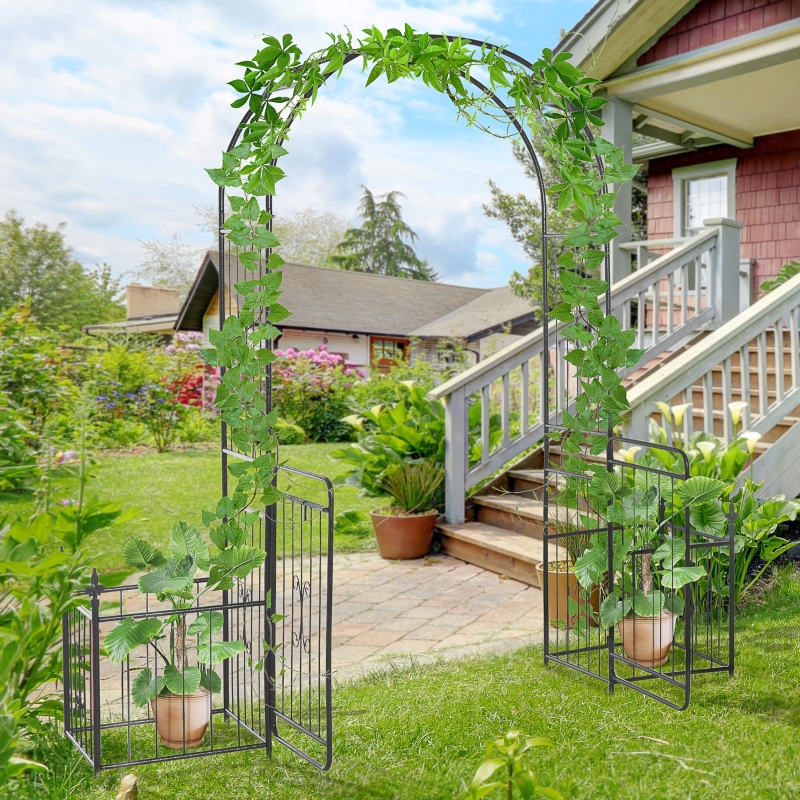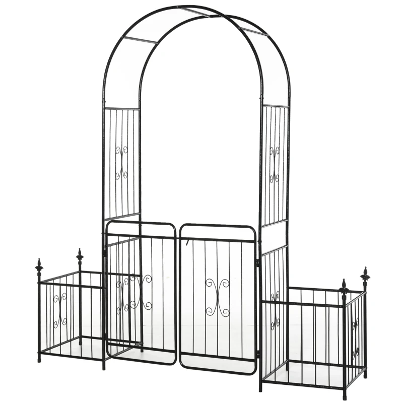Functional supporting arch: This garden arbor is great for supporting all kinds of flowering trellis plants, wall-climbing vines, or for displaying small hanging accent decorations. || Side planting boxes: with 2 planting boxes on each side, you can grow beautiful flowers in this garden arch for an even more gorgeous display. || Elegant appearance: There are wire patterns on the garden gate and side columns of this arch, which brings a unique charm to your garden with its delicate lines, patterns and elegant scrollwork. || Gate door design: The gate door of the arbor arch can be locked with a latch, creating a sense of privacy and can be used to close off an area. || Overall dimensions: 200W x 50D x 220H cm. Assembly required.