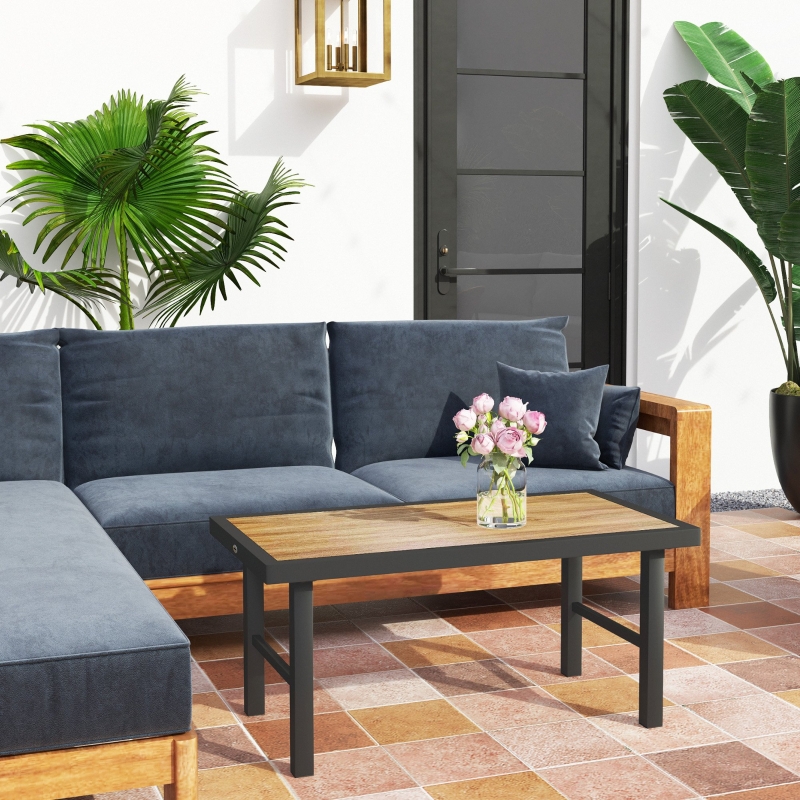 100 x 53 cm: This industrial coffee table provides lots of space for drinks, books and decorations during outdoor gatherings or lounging. || Wood grain effect: Featuring an enhanced wood grain finish, this coffee table effortlessly complements any garden decor, bringing a touch of natural elegance to your outdoor space. || Robust construction: Equipped with a powder-coated metal frame and SPC tabletop, this metal side table is waterproof, weather-resistant and not rust. Includes foot pads to prevent floor damage. || Versatile use: Great as an outdoor side table, this small garden table enhances both functionality and style in any outdoor setting, from balconies to gardens. || Dimension: 100L x 53W x 46H cm. Weight capacity: 30 kg. Easy to assemble.