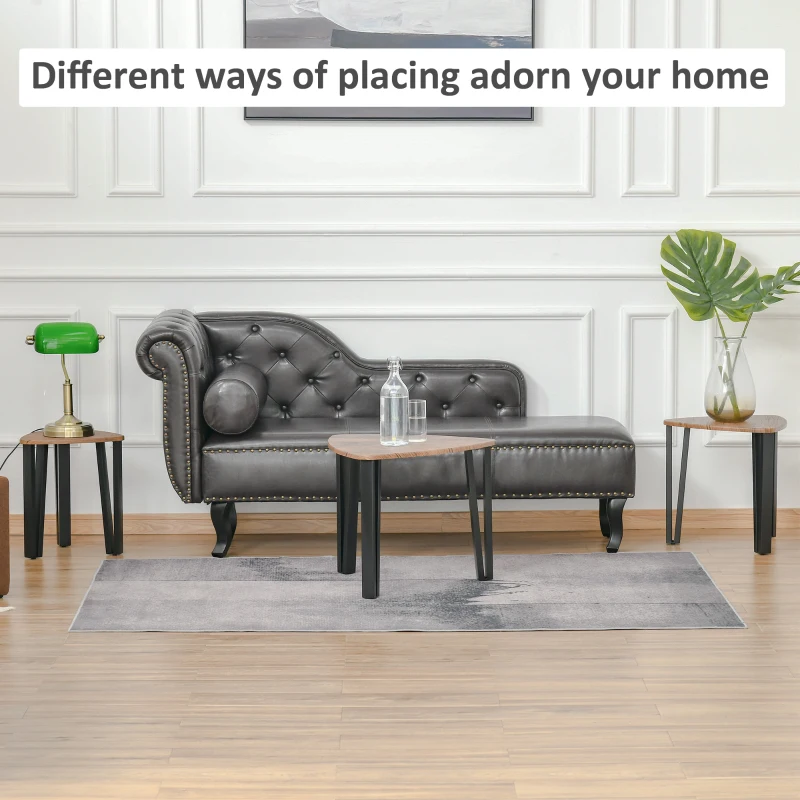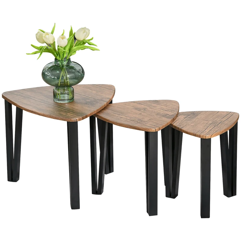 THREE PIECE SET: Comprised of a large, medium and small triangle table, these nesting tables give you plenty of space for magazines, cups, plates and storage etc. Trio creates a unique and beautiful focal point. || ‘V’ SHAPED PEG LEGS: Placed on each corner in a double shape for extra sturdiness and stability for the end tables, with foot pads to protect the floor from damage. || ASSEMBLY SIMPLIFIED: In an hour, your friends will arrive for a party? Take it easy. The assembly can be completed and snacks set up on these living room tables before the party begins with a simple structure and clear instructions || EASY TO MAINTAIN: Smooth laminated finish for effortless cleaning and resistance to water and damage. STACKABLE: These side tables can be nested together to help save space when not needed. || DIMENSIONS: Small: 41H x 36L x 34Wcm. Medium: 43H x 42L x 43.8Wcm. Large: 45.5H x 56L x 54.2Wcm. MAXIMUM WEIGHT CAPACITY: Weight capacity(each):20 kg. ASSEMBLY REQUIRED.
