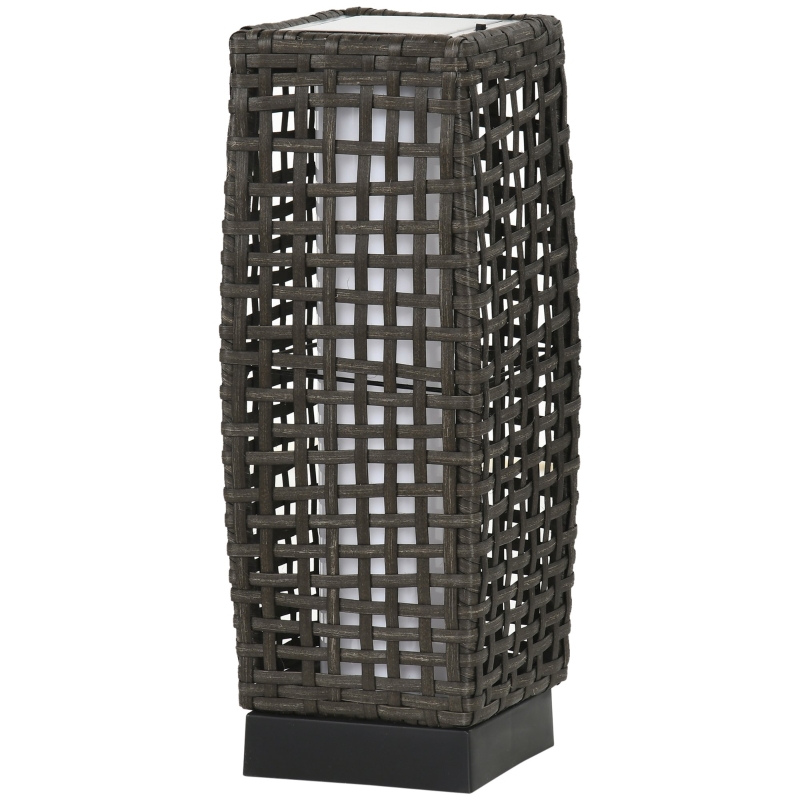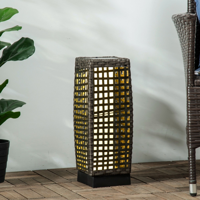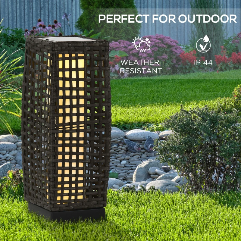 Solar powered: Top panel on this rattan floor lamp charges when sunlight is available during the day. Uses stored power when dark. Rattan solar lantern lasts for eight hours with full charge. || 15 lumens, warm white LED: 2500K colour temperature, this rattan lamp brings plenty of light to illuminate the area, so you can see better in the dark. Five-hour full charge for eight-hour illumination. || Steel frame, wrapped in rattan: A garden-ready look. Metal casing for strength, wrapped in plastic wicker for double the durability. || Tall, caged design: Something different for your outdoor space – looks great and blends in with the surroundings. || Dimensions: 46H x 17W x 17Dcm. Light: 2W x 12Dcm. IP44 water-resistance rating.