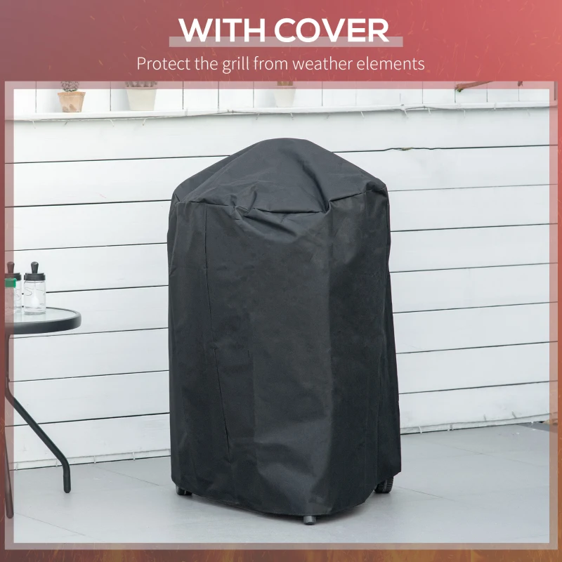 User-friendly: The Φ54cm grill cooks plenty at once, with a liftable centre for easy charcoal addition. Includes essential tools. Side hooks and bottom shelf provide lots of storage. || Lid with thermometer: It can smoke food gently when closed, with the thermometer allowing you to keep track of the temperature. Air vents on the outdoor bbq allow you to control the temperature easily with the lid down. || Solid use: The porcelain enamel coated lid and basin can resist 600 heat. Equipped with a protective 420D Oxford cover with PVC coating to resist water and dust great for repeated use outdoors. || Easy to move: This barbecue is equipped with 2 wheels and a handle on different sides, which allows you to move it around in your garden. || Dimension: 65L x 65W x 108H cm. Grill Height: 80cm.