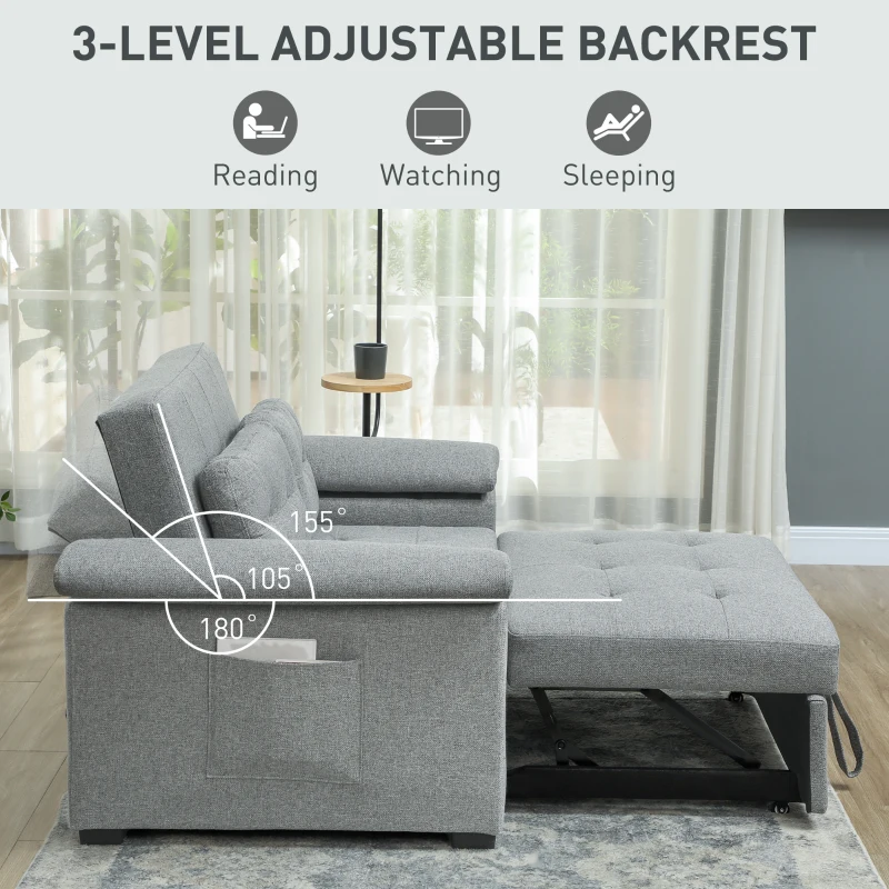 Three-in-one design: This chic two seater sofa easily converts into a recliner or a cosy single bed. With convenient bottom wheels and pull straps, you’ll be ready for unexpected guests in a snapgreat for space-saving || Comfort & Support: Both seat and pull-out section has an independent spring package filled with high-density sponge, ensuring comfort for sitting and sleeping. 24 cm wide armrest pads, thick cushions and two pillows provide extra cosiness and relaxation || Adjustable indulgence: Customise your comfort with three-position backrest of the small sofa bed. Whether you desire an upright seat for reading, a slight reclining status for watching or a fully reclined position for napping, find your way to relaxation || Stylish linen-look upholstery: Elevate your decor with textured upholstery combining tufted design, suitable for any living space. Our double sofa bed wrapped in linen-feel fabric is breathable and wear-resistant, offering both comfort and durability || Product dimensions: Loveseat sofa: 140W x 87.5D x 86H cm. Pull out bed: 99W x 180D x 44H cm. Overall weight capacity: 220 kg. 3-level adjustable backrest angle: 105°/155°/180°. Easy to assemble