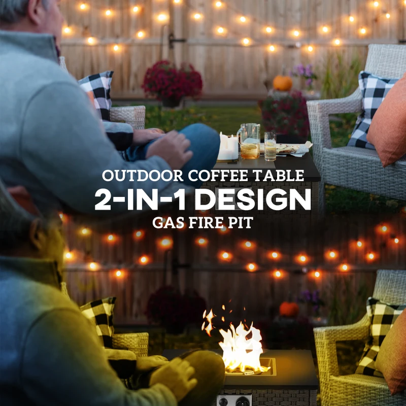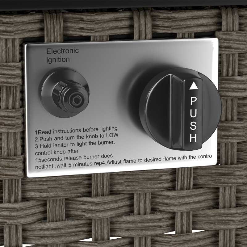 Duo design: Both a gas fire pit and an outdoor coffee table – do double the job in a compact size. Metal lid to cover the garden fire pit when needed as a four-person table. || 13 KW burner: Clean and smokeless burn, help retain the warmth longer. The small fire pit is controlled by an electric pulse ignition system (1x AAA battery required, not included). || Rattan-effect body: Powder coated steel gas fire table offers a strong core. All-weather three-strand plastic rattan add style and extra durability – effortlessly match with your garden furniture. || Safe: Outdoor fire pit table features a thermocouple – sense when the flame goes out/drop in temperature and close the valve. Regulator and 2.4 m hose for external LPG or propane tank (tank required, not included). || Dimensions: 33H x 58L x 58W cm. Maximum load 50 kg. Assembly required.