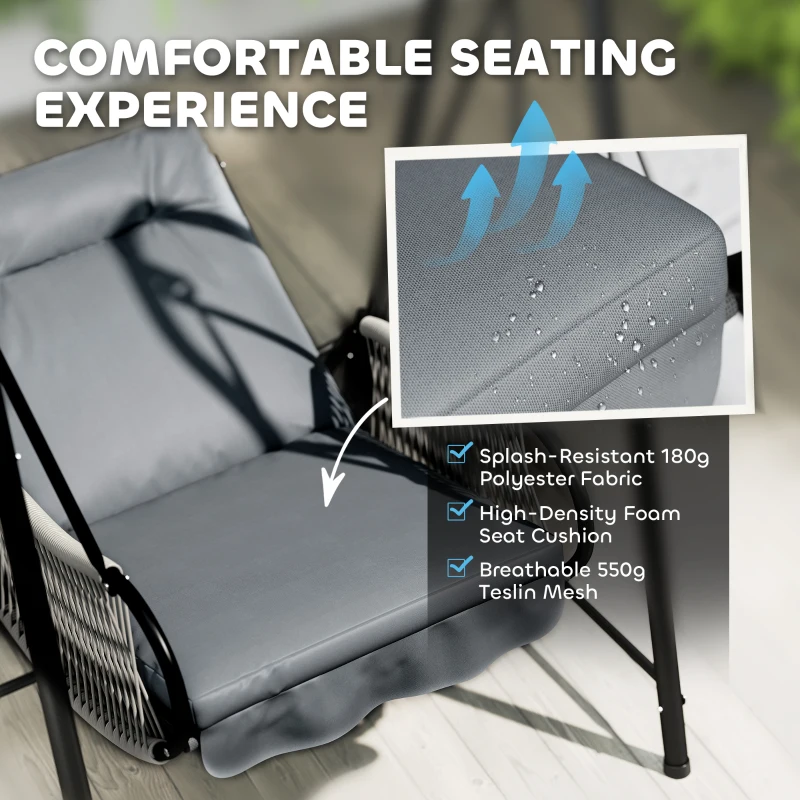 Comfortable seating experience: This swing chair is made from 180g polyester fabric and features a high-density sponge seat for exceptional comfort. The breathable 550g Teslin mesh ensures a cool, enjoyable seating experience when the cushion is removed. || Stylish and weatherproof rattan: The armrests of this outdoor hanging chair are wrapped in UV-resistant PE rattan, offering up to 1000 hours (level 4) of protection against the sun, ensuring both durability and a distinctive aesthetic. || Robust and stable structure: Built with a heavy-duty steel frame, this garden swing with stand is resistant to deformation and promises stability, thanks to its reinforced steel base and triangle construction, which effectively prevents tipping. || Fits indoors and outdoors: Suitable for both indoor and outdoor use, this garden hanging chair is a versatile choice for creating a cosy nook in your garden, porch, deck or any desired location. || Overall dimensions: 100W x 115D x 144H cm. Seat size: 71W x 66D x 48H cm. Weight capacity: 120 kg. Assembly required.