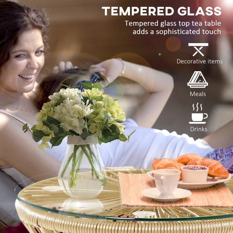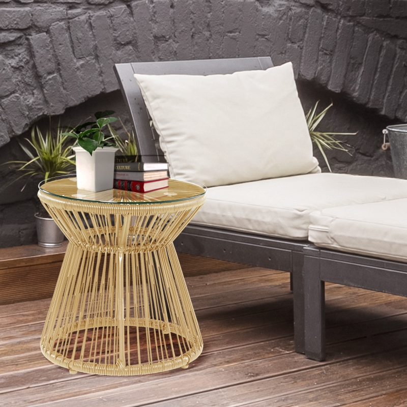 Rattan string design: A modern take on wicker, this garden rattan table is a cool piece for your outdoor space. || Tempered glass tabletop: Garden coffee table offers a safe and sleek holding place, to keep things close to you. || Steel frame: Powder coated for extra strength, a strong core for this rattan coffee table. || Large base: Keeps this garden side table balanced and steady. Footpads to gently protect floor beneath; || Dimensions: 42H x Ф40cm. Maximum load 30kg. No assembly required.