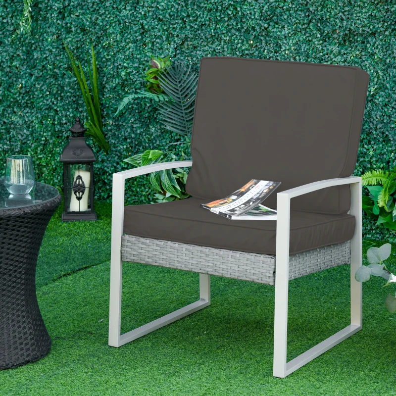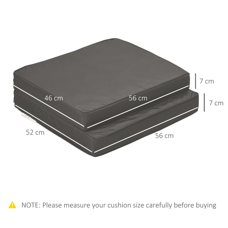 Seat and back cushion set: Garden chair cushions to refresh your seat – use on rattan, wood and metal chairs. Suitable for indoors and outdoors. || Fabric covers: Soft polyester is gentle on the skin. || Padded filling: Keep comfortable on these outdoor seat cushions – relax for prolonged periods. || Removable and washable covers: Outdoor chair cushions can be kept clean easily. || Dimensions: Seat cushion: 56L x 52W x 7Hcm. Back cushion: 56L x 46W x 7Hcm.