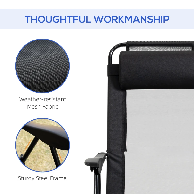 TWO-CHAIR SET: A place for you and a friend to lounge and relax. The easy way to enjoy your garden and outdoor areas, anytime. || ADJUSTABLE BACK: Sets to five different levels – lie back in a position you like. Take some time out, read a book or have a drink – plenty of position to do a multitude of activities. || STEEL FRAME: Strong core structure, keeps you fully supported as you sit. Base shape promotes balance. Fabric seat holds you comfortably, with a padded pillow for extra support. || FOLDABLE: Easy to move and store. DIMENSIONS: 109H x 62W x 70Dcm. Folded: 10H x 99L x 62Wcm. || MAXIMUM LOAD 120KG. NO ASSEMBLY REQUIRED – UNPACK AND USE!