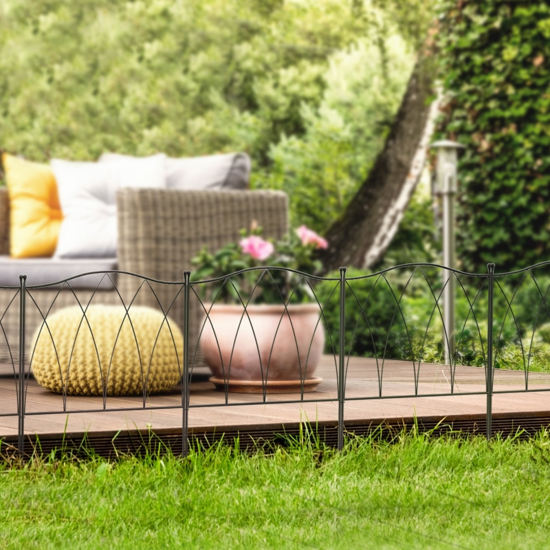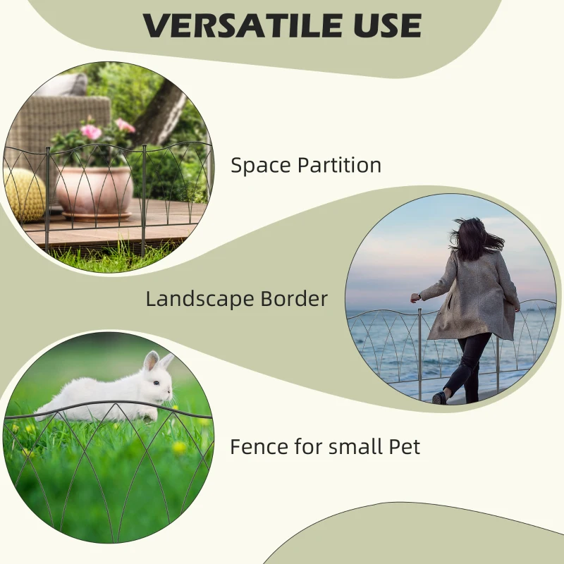 3.05m long, flexible shape: Decorative garden fence panels can be set to a shape which you want. Great for plenty of different areas. Each piece measures 61.5W x 62Hcm. || Line design: Border fence features brings decorative touch to wherever you want. A great home entrance piece. || Powder-coated metal frame: Metal fence panels are tough and durable. Suitable for outdoor use. || Easy to set up: Simply connect the fencing panels together with the included clips and insert the feet into ground. || Dimension: 62H x 305Wcm. Easy to assemble.