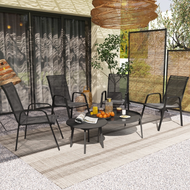 Set of four: Stackable outdoor chairs are great for relaxing with friends outdoors. || Stackable: Keep together when not being used. Easy to store away with little space. || Comfortable: Mesh fabric on each stackable chair helps reduce muscle tension and stress. High backs for support. || Metal frames: Powder coated for extra strength, these garden dining chairs support you well. || Dimensions: 95H x 54L x 75.5W cm. Seat: 41H x 44.5W x 45D cm. Maximum load 150 kg. Assembly required.