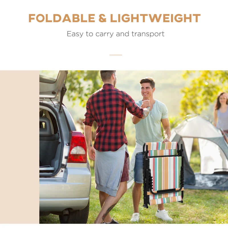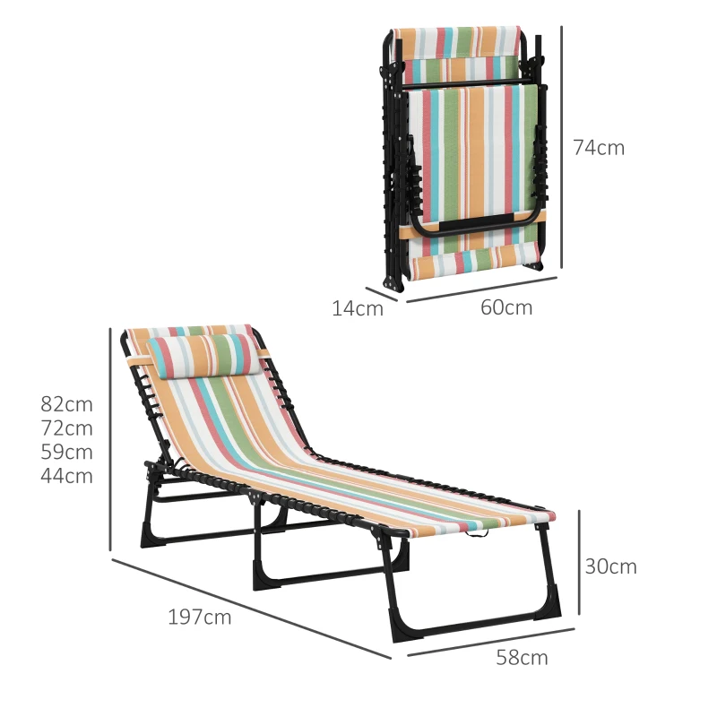 2 pieces practical garden lounge: The outdoor folding sun lounger is a perfect companion on a cool night, a leisurely afternoon or a decompressing holiday. || Adjustable backrest: The garden sun lounger backrest is 4-level adjustable and can meet your different needs, like reading a book or taking a nap. || Stable and cosy: This portable sun lounger is made of powder coated steel frame guarantees a stable standing and the 100% plastic fabric with a double elastic rope suspension system provides a comfortable yet strong support. || Foldable design: With the trifold design, the sun loungers for garden are space-saving when you store them in the corner or put them in the trunk when travelling. || Dimensions: Overall Dimension: 197L x 58W x 30Hcm, Folded Dimension: 74L x 14W x 58Hcm.