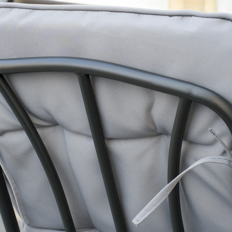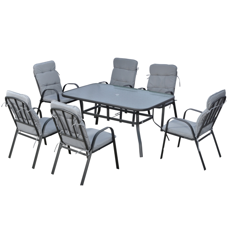 Seven-piece garden dining set: Comes with six cushioned chairs and a matching dining table. Seats six – relax and unwind with company. || Glass-top table, with umbrella hole: Relax with protection in this six-seater garden furniture set. Hole fits parasol umbrella with a Ф38 mm sized pole. || Padded chairs: Sink and relax whilst seated on this outdoor table and chairs set. High back and armrests for support. || Steel frames: The outdoor furniture set has a strong metal core to offer support as you sit. || Dimensions: Table: 71H x 152.5L x 96.5W cm. Chair: 92H x 55W x 70.5D cm. Maximum load: Table: 50 kg. Chair: 120 kg. Assembly required.