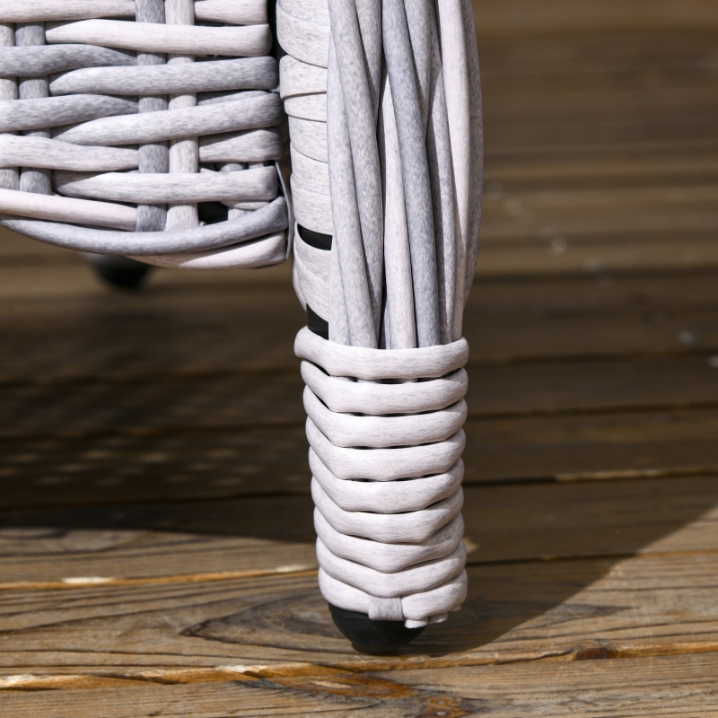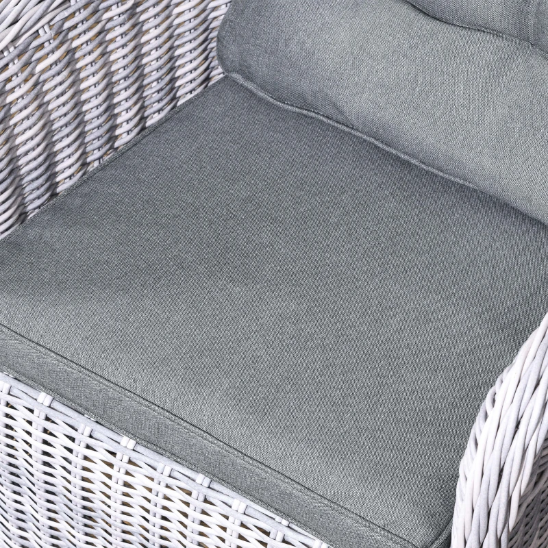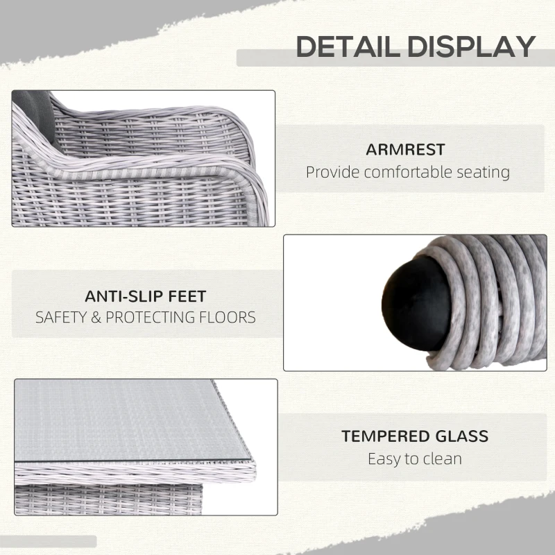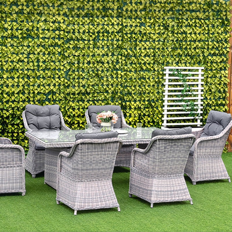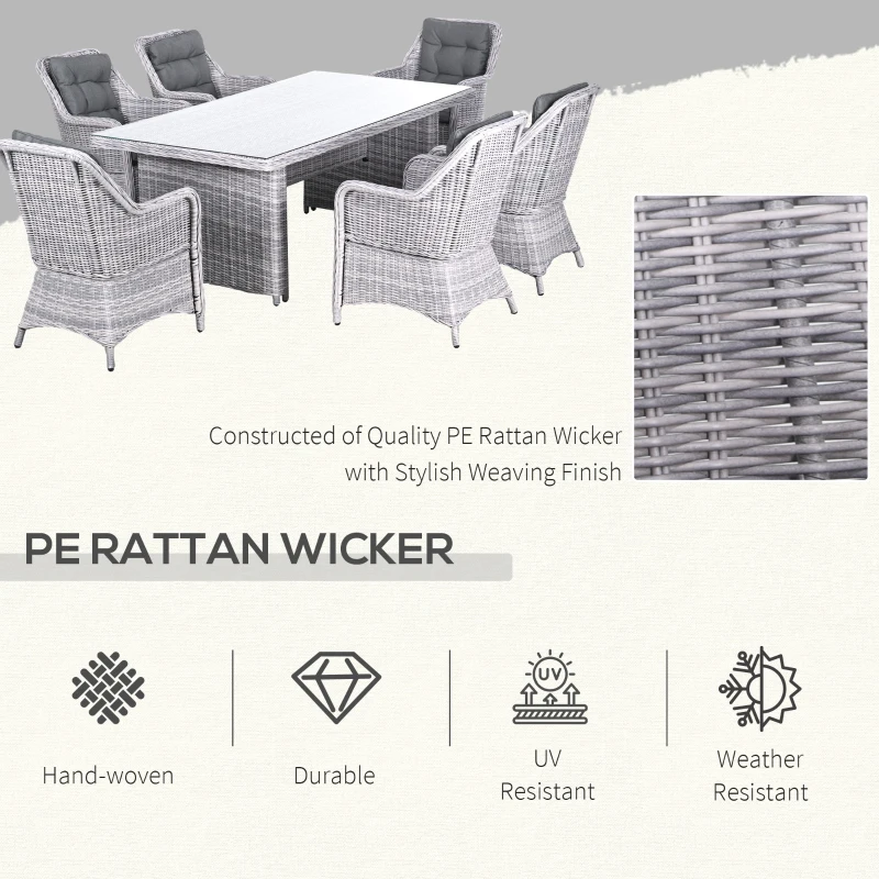 Seven-piece garden dining set: Comes with six elevated armchairs and a matching dining table – gather round with your favourite company outdoors – dine and drink under the sun. || Aluminium frames, wrapped in rattan: Powder-coated metal means a strong structure. Top layer of the chairs and table in this rattan dining set is stylish and weather-resistant for maximum wear. || Tempered glass-top table: A sleek touch to this garden dining set. Also a solid and safe surface to dine from. Smooth finish which wipes clean easily. || Padded seat and back cushions: Keep comfortable when using this garden dining furniture set. Seat covers are removable and washable. || Dimensions: Chair: 92H x 65L x 75W cm. Table: 74H x 200L x 100W cm. Maximum load: Chair: 160 kg. Table: 70 kg. Assembly required.