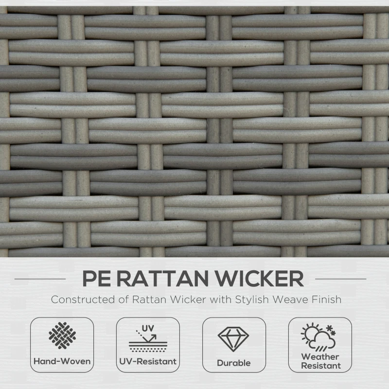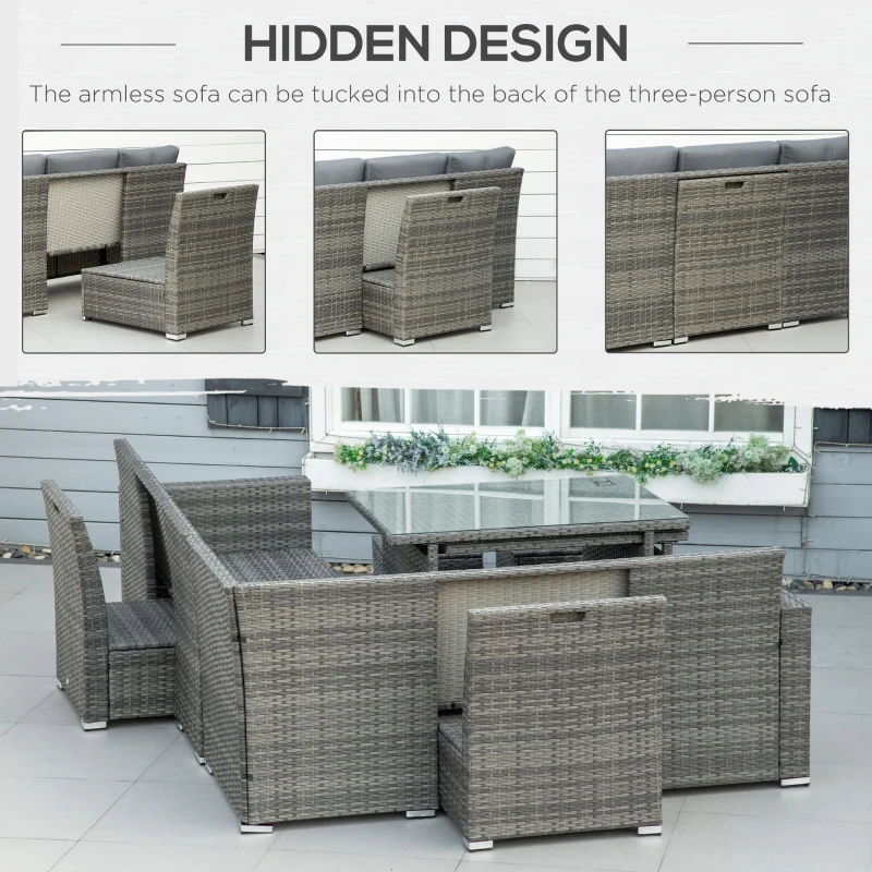 Seven-piece rattan garden sofa set: Formed of a three-seater corner sofa, a three-seater sofa, two chairs and dining table. Freestanding pieces to set into a shape you want. Seats ten. || Expandable table: Garden sofa set can cater for more people when needed. From 177 x 80 x 67cm to 287 x 80 x 67cm. || Nesting chairs: The armless chairs can be tucked into the back of the three-seater sofa. Saves space and keeps your garden tidy. || Comfortable: Each piece in this rattan garden furniture set comes with padded cushions. Removable and washable covers. || Dimensions: Three-seat sofa: 171W x 80D x 81Hcm. Corner sofa: 190W x 80D x 81Hcm. Chair: 62W x 75D x 77Hcm. Assembly required.