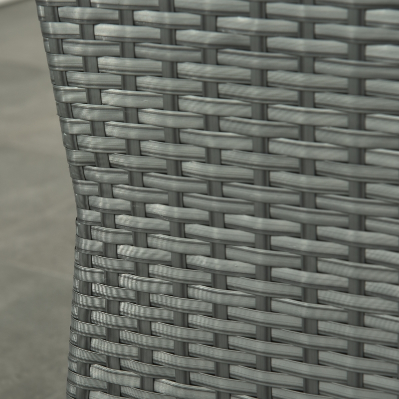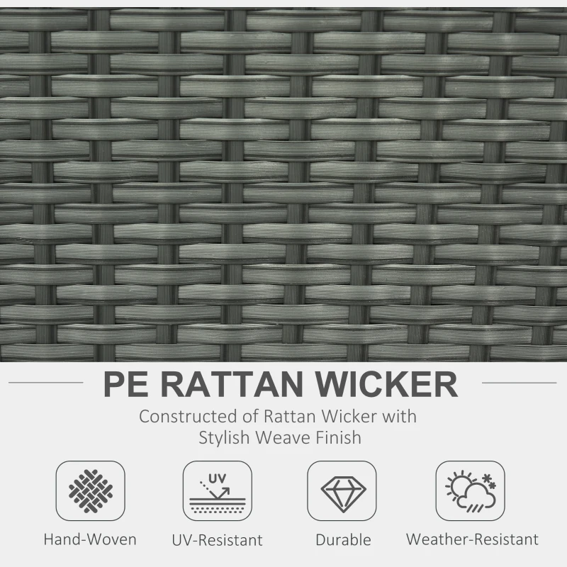 Six-piece garden sofa set: Formed of two armchairs, a three-seater sofa, two footstools and matching table. Footstools can be stored under coffee table to save space. || 90°-130° reclining armchairs: Both of the armchair backs go to a position of your choice. Time outdoors made even more relaxing and enjoyable. || Steel, wrapped in rattan: Powder coated metal for a strong core, each piece in this garden rattan furniture set has a plastic outer – a stylish and protective coating. || Padded cushions: Placed on the seats and backs so you can sit comfortably all day long. Machine washable covers are resistant to light water and stains. || Dimensions: Armchair: 81H x 75W x 69Dcm. Sofa: 73H x 172W x 67Dcm. Footstool: 30H x 46Lx 52Wcm. Table: 38H x 112L x 52W. Maximum load weight: Armchair: 160kg. Sofa: 480kg. Table: 70kg. Assembly required.