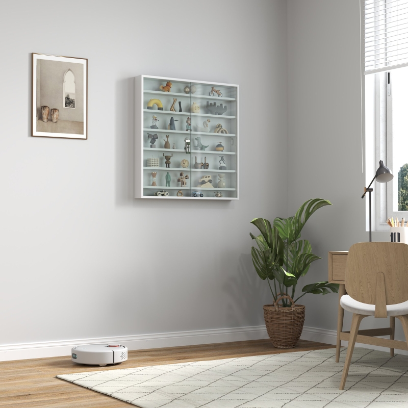 Six adjustable shelves: With eleven different positions to set in this glass cabinet, set up how you want, to fit in differently-sized items. || Glass doors: Both move to the side, allowing easy access inside, whilst keeping everything protected. Smooth groove handles for opening and closing. || Particle board frame: Ensures a tough and robust structure, making it safe and reliable for keeping everything displayed and in place on the wall. || Wall mountable: Great for places with little room, saving floor space. Dimensions: 83H x 80W x 9.5Dcm. Each door: 57.5H x 39Wcm. || Maximum load 2kg per shelf. Assembly required.