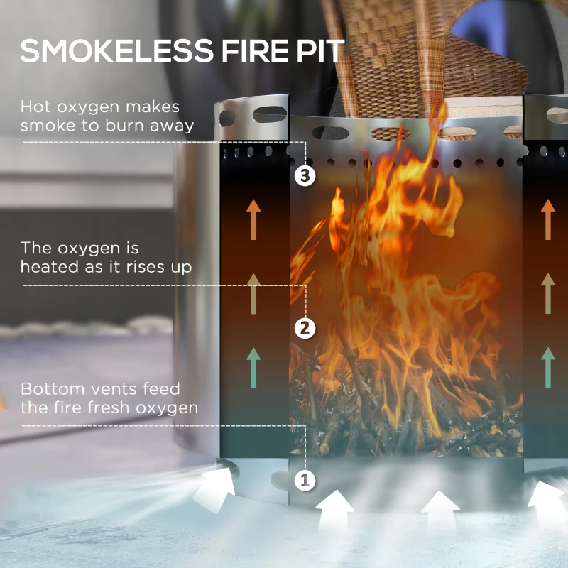 Smokeless two-part combustion system: Oxygen travels through the bottom vent holes, as warm oxygen channels between the walls – fire burns strong. Also means fuel burns down to ash in this fire pit – no smoke. || Modern stainless steel design: A cool and slick outdoor fire pit. Tough and has high heat resistance, suitable for outdoor use. || Poker included: Easy to move log pieces required to fuel this portable fire pit – without potentially burning yourself. || No assembly required: Use this fire bowl straight from the box. || Dimensions: 38.5H x Φ48.5cm. Inner: Φ40cm. Poker: 65Lcm.