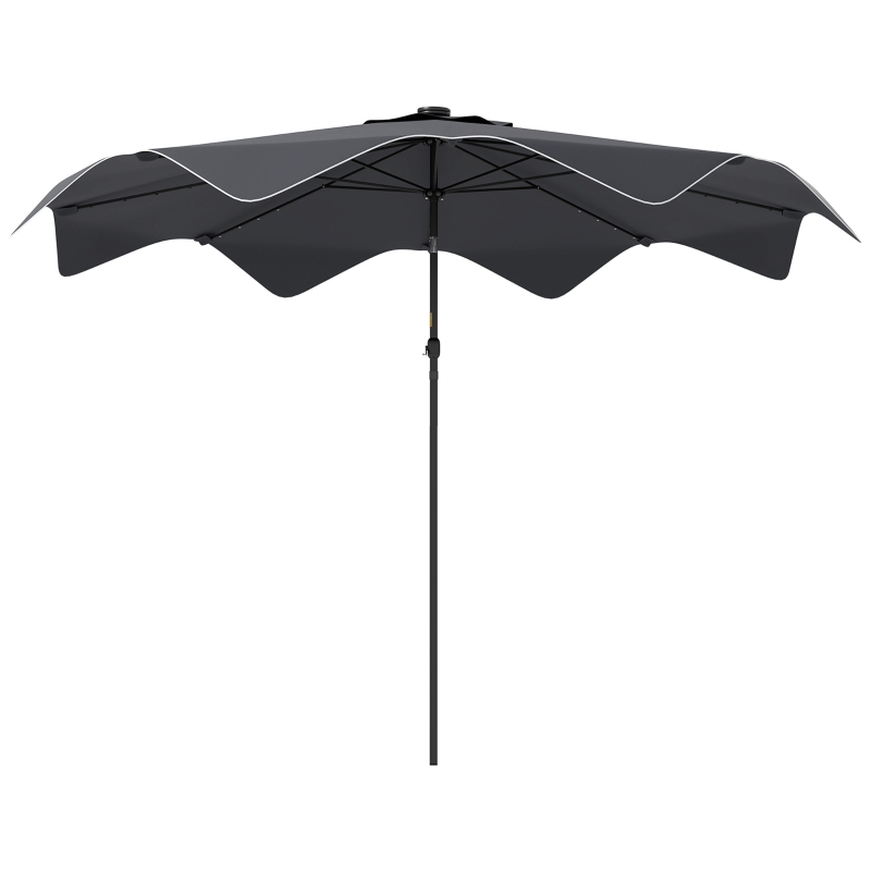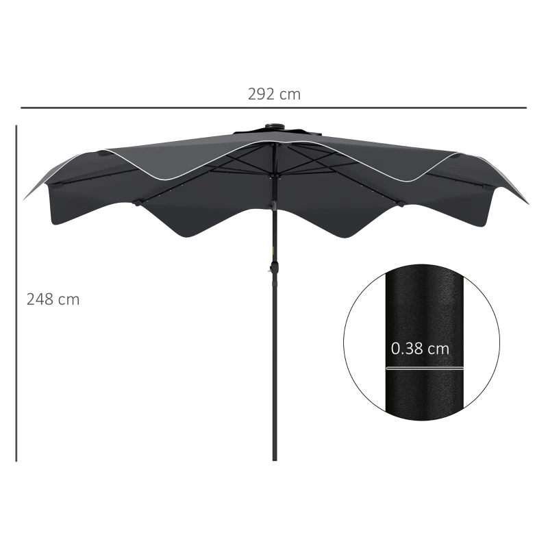 32 solar-powered LED lights: Fitted on each rib, this parasol with lights is ideal for evening and night times – keeps your outdoor space gently lity up. Lights charge from the sun in the day, ready to use when dark. || 45° tilting canopy, with top vent: Adjust the top of this solar parasol on both sides – helps block the sun at different angles. Vent gently allows air from the top, helps prevent canopy turning inside out. || Powder coated metal frame: A strong core for this garden parasol with lights. Eight ribs support the canopy shape. || Crank handle: Open and close the canopy of this tilting parasol easily. || Dimensions: 2.48H x 2.92m. Parasol base minimum weight: 25kg. Suitable Best base skus: 840-117 and 84D-122. Do not leave parasol up in heavy weather.