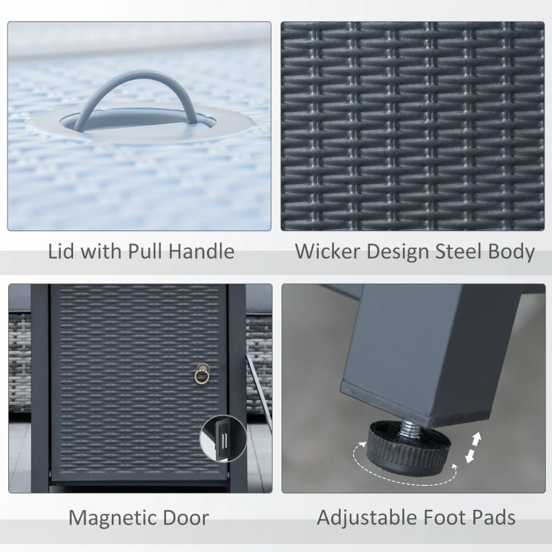 Duo design: Both a gas fire pit and an outdoor dining table – do double the job in a compact size. Lid to cover the gas fire pits for garden when needed as a table. || 40,000 BTU burner, with smokeless fire pit: Clean and smokeless burn, help retain the warmth longer. Pulse ignition system starts and adjusts flame easily (1 x AAA battery required). || Gas-powered: Propane tank, easily installs into the base. Protected by the door to keep smokeless fire pit out of sight. || Rattan-effect body: A garden-beautiful gas fire pit table, effortlessly matches with your other furniture. || Dimensions: 62H x 71L x 71Wcm. Regulator and hose are pre-installed. Assembly required.