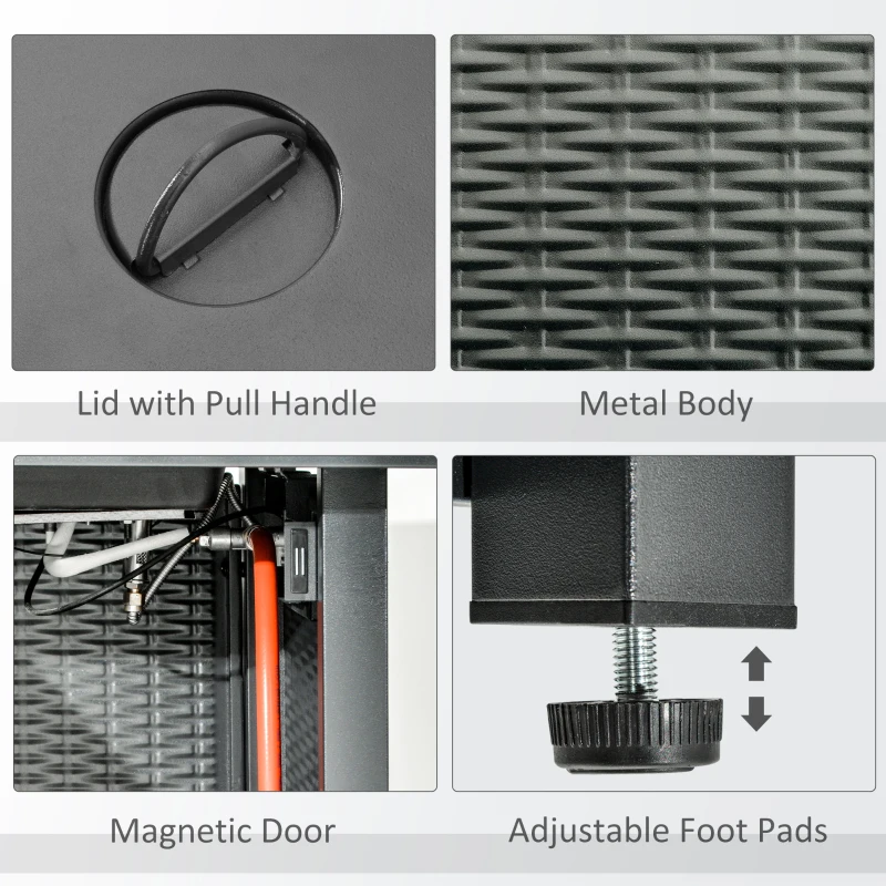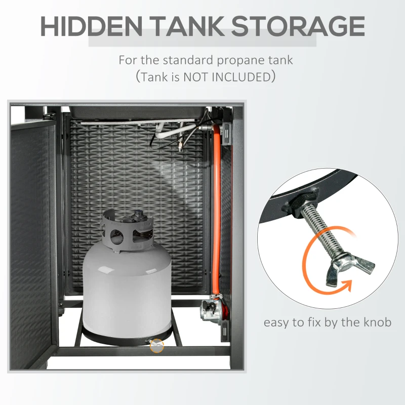 DUO DESIGN: Both a gas fire pit and an outdoor dining table – does double the job in a compact size. Lid to cover the smokeless fire pit when needed as a table. || 40000 BTU BURNER: Clean and smokeless burn, help retain the warmth longer. Electronic ignition system starts and adjusts flame easily. || GAS-POWERED: Propane tank, easily installs into the base of the gas fire pits for garden. Protected by the door to keep it out of sight. || COVER INCLUDED: Keep the fire pit table covered and protected when not being used. DIMENSIONS: 71L x 71W x 62Hcm. || REGULATOR AND HOSE INCLUDED – TANK IS NOT INCLUDED.