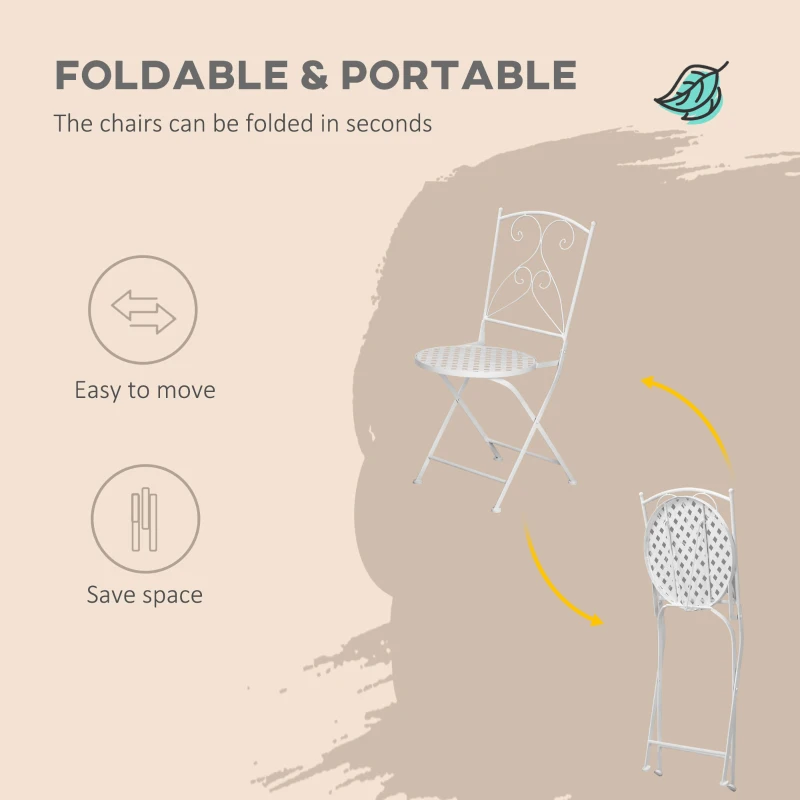 Three-piece set: Garden bistro set is formed of two single chairs and a matching table – room to bring you and a friend together, whether in the garden, as balcony furniture or standing in the outdoor patio space and beyond. || Elegant seats and tabletop: Scrolling on the chair backs and tops. Ceramic tiles on the tabletop – adds a touch of elegance to your gardens. A subtle touch to the set for something different. || Folding: Both the balcony chairs and table are easy to half in size to carry easily and store in smaller spaces – bring out and use whenever required. || Metal structures: Top coating for extra protection and durability, each piece is strong and tough. Wear-resistant, suited for outdoor use. || Dimensions: Table: 76.5H x Φ61cm. Chair: 87H x 40W x 52Dcm. Maximum load: Table: 60kg. Chair: 120kg. Table requires assembly.