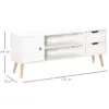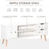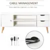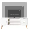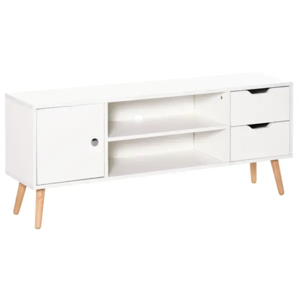 SCANDINAVIAN STYLE: Clean and simple – this TV stand cabinet can act as a minimal backdrop for your homeware and decorations to stand out. For TV sizes no larger than 50″. || BUILT-IN STORAGE: Features two open shelves, cabinet with shelf and two drawers – the TV cabinet can keep your room clean and tidy. || PINE WOOD LEGS: Natural finish complements the white structure, outwardly angled to keep the tv table balanced and stable. || CABLE HOLES: No more messy wires. DIMENSIONS: 44H x 120L x 28Wcm. Shelf inner: 10.5H x 25L x 18D x 10.5Hcm. || MAXIMUM LOAD: Whole: 30kg. Shelf: 5kg. ASSEMBLY REQUIRED.