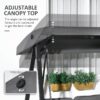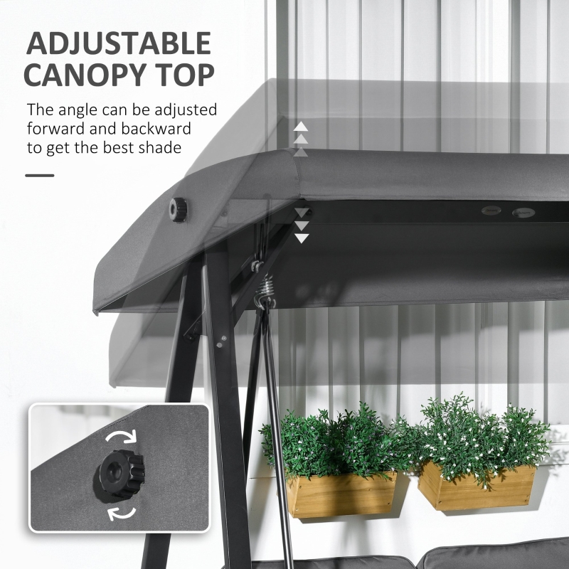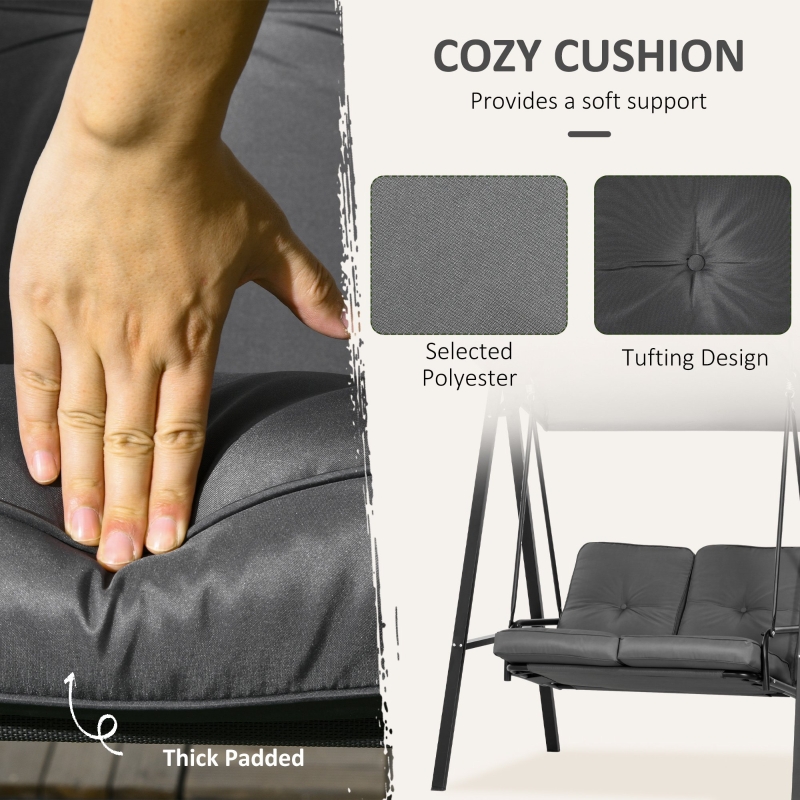 Two-seater swing chair: Sit with company or enjoy extra room to yourself. || Adjustable canopy: Set top of sun shelter to different angles – keeps you protected at different positions. || Padded seat: Sit comfortably on this garden swing chair all day long. || Steel frame: Powder coated for extra strength, supports you as you sit on this swinging garden chair. ‘A’ shaped legs help promote balance. || Dimensions: 172H x 145L x 116Wcm. Maximum load 220kg. Assembly required.